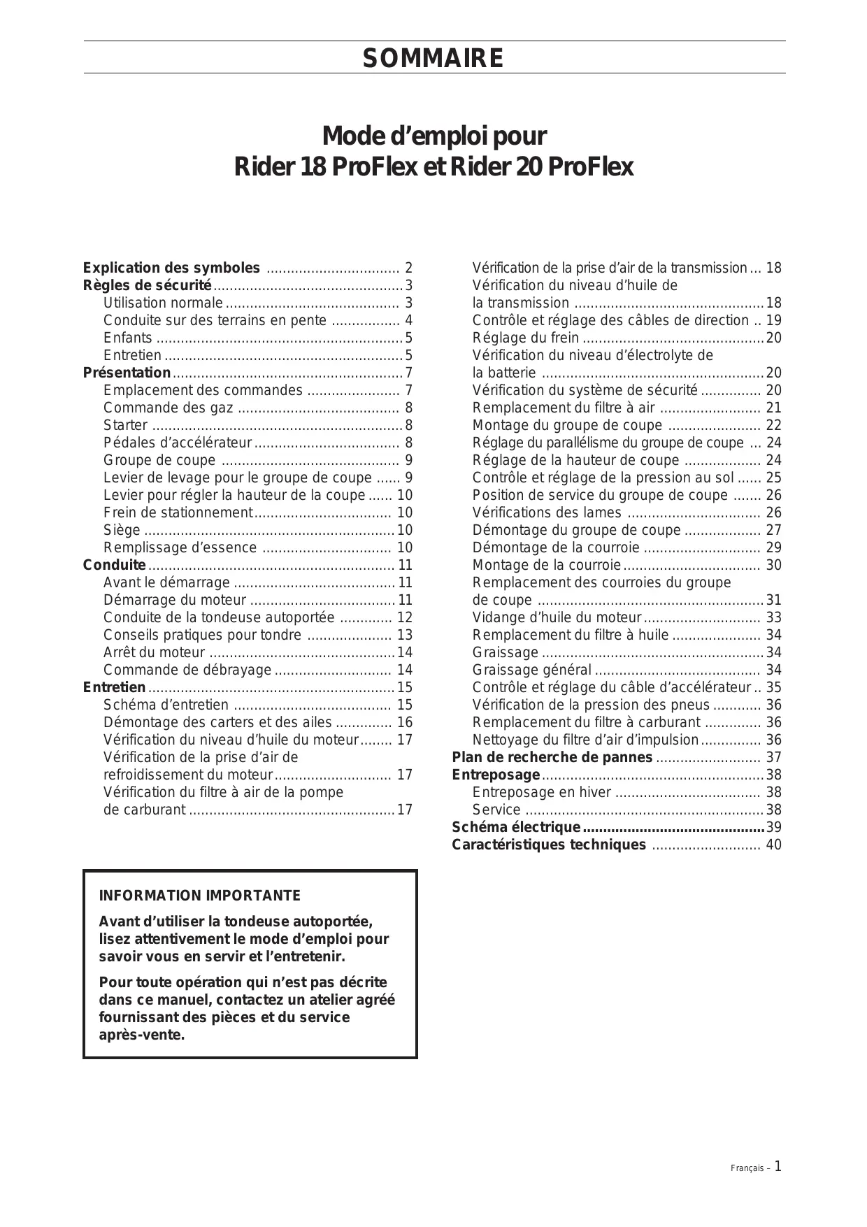 - Caractéristiques techniques INFORMATION IMPORTANTE Avant d’utiliser la tondeuse autoportée, lisez attentivement le mode d’emploi pour savoir vous en servir et l’entretenir. Pour toute opération qui n’est pas décrite dans ce manuel, contactez un atelier agréé fournissant des pièces et du service après-vente. Français – p. 40