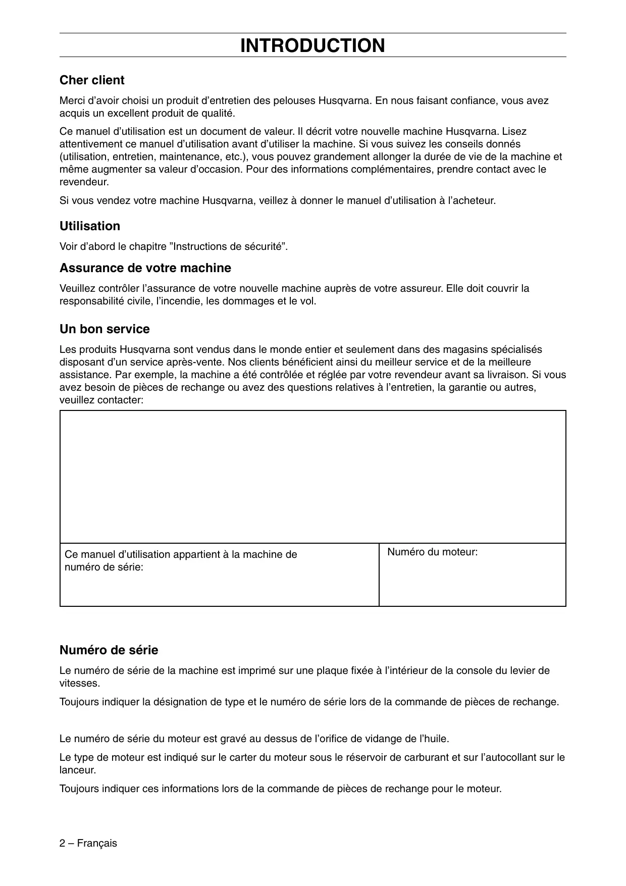 - Après les 20 premières heures Français – 1 INTRODUCTION Cher client Merci d’avoir choisi un produit d’entretien des pelouses Husqvarna. En nous faisant confiance, vous avez acquis un excellent produit de qualité. Ce manuel d’utilisation est un document de valeur. Il décrit votre nouvelle machine Husqvarna. Lisez attentivement ce manuel d’utilisation avant d’utiliser la machine. Si vous suivez les conseils donnés (utilisation, entretien, maintenance, etc.), vous pouvez grandement allonger la durée de vie de la machine et même augmenter sa valeur d’occasion. Pour des informations complémentaires, prendre contact avec le revendeur. Si vous vendez votre machine Husqvarna, veillez à donner le manuel d’utilisation à l’acheteur. Utilisation Voir d’abord le chapitre ”Instructions de sécurité”. Assurance de votre machine Veuillez contrôler l’assurance de votre nouvelle machine auprès de votre assureur. Elle doit couvrir la responsabilité civile, l’incendie, les dommages et le vol. Un bon service Les produits Husqvarna sont vendus dans le monde entier et seulement dans des magasins spécialisés disposant d’un service après-vente. Nos clients bénéficient ainsi du meilleur service et de la meilleure assistance. Par exemple, la machine a été contrôlée et réglée par votre revendeur avant sa livraison. Si vous avez besoin de pièces de rechange ou avez des questions relatives à l’entretien, la garantie ou autres, veuillez contacter: Ce manuel d’utilisation appartient à la machine de numéro de série: Numéro du moteur: Numéro de série Le numéro de série de la machine est imprimé sur une plaque fixée à l’intérieur de la console du levier de vitesses. Toujours indiquer la désignation de type et le numéro de série lors de la commande de pièces de rechange. Le numéro de série du moteur est gravé au dessus de l’orifice de vidange de l’huile. Le type de moteur est indiqué sur le carter du moteur sous le réservoir de carburant et sur l’autocollant sur le lanceur. Toujours indiquer ces informations lors de la commande de pièces de rechange pour le moteur. 2 – Français p. 50