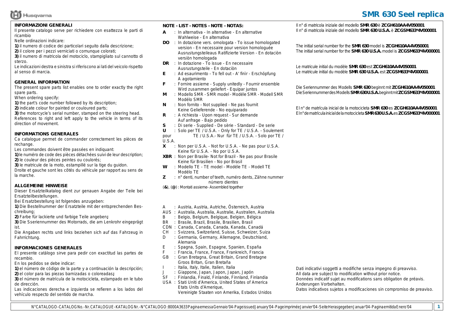 1) le numéro de code des pièces détachées suivi de leur description; 2) le couleur des pièces peintes ou coulorés; 3) le matricule de la moto, estampillé sur la tige du guidon. Droite et gauche sont les côtés du véhicule par rapport au sens de la marche. ALLGEMEINE HINWEISE Dieser Ersatzteilkatalog dient zur genauen Angabe der Teile bei Ersatzteilbestellungen. Bei Ersatzbestellung ist folgendes anzugeben: 3) el número de matrícula de la motocicleta, estampado en le tubo de dirección. Las indicaciones derecha e izquierda se refieren a los lados del vehículo respecto del sentido de marcha.