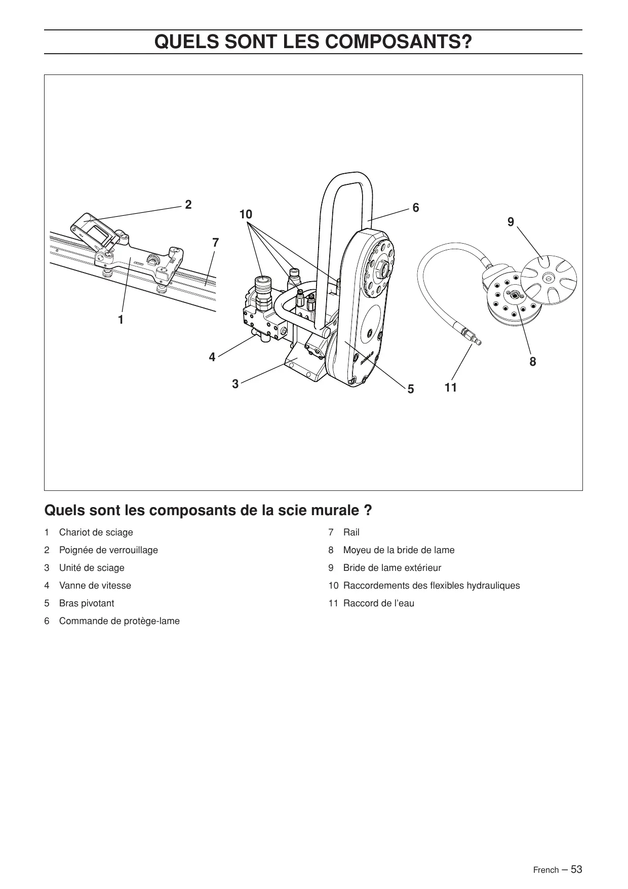 Etant donné qu'il est possible de sélectionner le sens de rotation de la lame, le jet d'eau de la lame peut également être réglé, quelle que soit l'orientation de la scie sur le rail. French – 57 PRÉSENTATION WS 462 Pour profiter de manière optimale de la puissante d’entrée, la scie est montée sur le nouveau rail Husqvarna. Ce rail est extrêmement stable, ce qui permet de guider la scie de manière plus précise et donc d’obtenir un sciage plus efficace. Les composants individuels de l’équipement fonctionnent avec de petites pertes et la lame a été déplacée de 50 mm par rapport aux modèles antérieurs, ce qui permet d’obtenir une conception extrêmement compacte de la scie et une meilleure efficacité. Un équipement de sciage complet est constitué de : Nous espérons que cette machine vous donnera toute satisfaction et qu’elle vous accompagnera pendant de longues années. N’oubliez pas que ce manuel d’utilisation est important. En suivant les instructions qu’il contient (utilisation, révision, entretien, etc.), il est possible d’allonger considérablement la durée de vie de la machine et d’augmenter sa valeur sur le marché de l’occasion. En cas de vente de la machine, ne pas oublier de remettre le manuel d’utilisation au nouveau propriétaire. L’achat de l’un des nos produits garantit une assistance professionnelle pour l’entretien et les réparations. Si la machine n’a pas été achetée chez l’un de nos revendeurs autorisés, demandez l’adresse de l’atelier d’entretien le plus proche. Husqvarna Construction Products travaille constamment à améliorer la construction de ses produits. Husqvarna se réserve donc le droit de procéder à des modifications de construction sans avis préalable et sans autres engagements. Généralités WS 400 est une toute nouvelle série de scies murales proposée par Husqvarna. Notre objectif lors du développement de la série Husqvarna WS 400 a été d’utiliser des méthodes de production modernes et des matériaux extrêmement performants afin de concevoir une scie murale légère, puissante et facile à utiliser par une seule personne. Parmi les nouveautés offertes par la série WS 400, remarquons, entre autres, la possibilité de fixer la lame radialement sur la scie. L’unité de sciage est montée sur un chariot à l’aide d’une fixation rapide et non pas directement sur le rail, ce qui facilite considérablement le montage de la scie. 58 – French