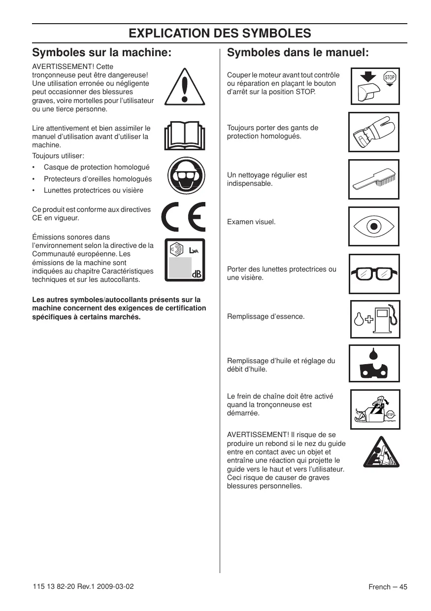 SOMMAIRE Sommaire EXPLICATION DES SYMBOLES Symboles sur la machine: Symboles dans le manuel: SOMMAIRE Sommaire INTRODUCTION Cher client, QUELS SONT LES COMPOSANTS? Quels sont les composants de la tronçonneuse? . INSTRUCTIONS GÉNÉRALES DE SÉCURITÉ Mesures à prendre avant de mettre en usage une tronçonneuse neuve Important! Utilisez toujours votre bon sens Équipement de protection personnelle Équipement de sécurité de la machine Équipement de coupe MONTAGE Montage du guide-chaîne et de la chaîne MANIPULATION DU CARBURANT Carburant Remplissage de carburant Sécurité carburant DÉMARRAGE ET ARRÊT Démarrage et arrêt TECHNIQUES DE TRAVAIL Avant chaque utilisation: Méthodes de travail Mesures anti-rebond ENTRETIEN Généralités Réglage du carburateur Contrôle, maintenance et entretien des équipements de sécurité de la tronçonneuse Silencieux Lanceur Filtre à air Bougie Graissage du pignon d’entraînement du guide Graissage du roulement à aiguilles Réglage de la pompe à huile Système de refroidissement Épuration centrifuge ”Air Injection” Utilisation hivernale Schéma d’entretien CARACTÉRISTIQUES TECHNIQUES Caractéristiques techniques Combinaisons guide-chaîne et chaîne