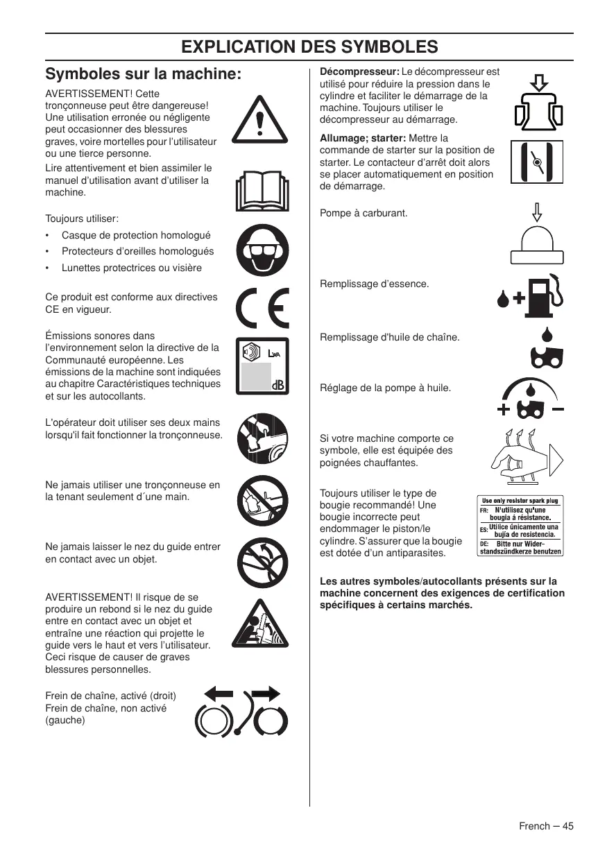 Lunettes protectrices ou visière Décompresseur: Le décompresseur est utilisé pour réduire la pression dans le cylindre et faciliter le démarrage de la machine. Toujours utiliser le décompresseur au démarrage. Allumage; starter: Mettre la commande de starter sur la position de starter. Le contacteur d’arrêt doit alors se placer automatiquement en position de démarrage. Pompe à carburant. Remplissage d’essence. Ce produit est conforme aux directives CE en vigueur. Émissions sonores dans l’environnement selon la directive de la Communauté européenne. Les émissions de la machine sont indiquées au chapitre Caractéristiques techniques et sur les autocollants. L'opérateur doit utiliser ses deux mains lorsqu'il fait fonctionner la tronçonneuse. Ne jamais utiliser une tronçonneuse en la tenant seulement d´une main. Ne jamais laisser le nez du guide entrer en contact avec un objet. AVERTISSEMENT! Il risque de se produire un rebond si le nez du guide entre en contact avec un objet et entraîne une réaction qui projette le guide vers le haut et vers l’utilisateur. Ceci risque de causer de graves blessures personnelles. Remplissage d'huile de chaîne. Réglage de la pompe à huile. Si votre machine comporte ce symbole, elle est équipée des poignées chauffantes. Toujours utiliser le type de bougie recommandé! Une bougie incorrecte peut endommager le piston/le cylindre. S’assurer que la bougie est dotée d’un antiparasites. Les autres symboles/autocollants présents sur la machine concernent des exigences de certification spécifiques à certains marchés. Frein de chaîne, activé (droit) Frein de chaîne, non activé (gauche) French – 45