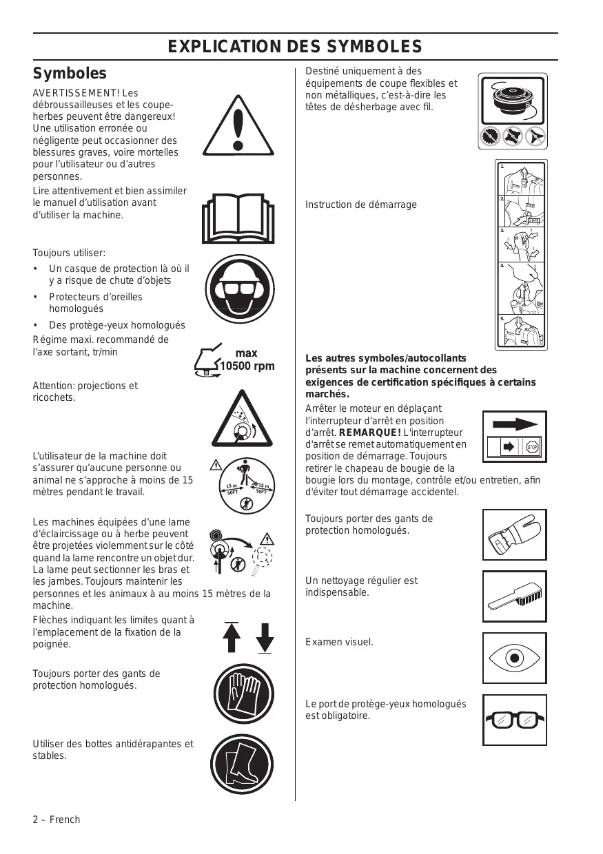 Éviter d’utiliser la machine en cas de fatigue, d’absorption d’alcool ou de prise de médicaments susceptibles d’affecter l’acuité visuelle, le jugement ou la maîtrise du corps. Utiliser les équipements de protection personnelle. Voir au chapitre ”Équipement de protection personnelle”. Ne jamais utiliser une machine qui a été modifiée au point de ne plus être conforme au modèle original. Ne jamais utiliser une machine qui n’est pas en parfait état de marche. Suivre dans ce manuel d’utilisation les instructions de maintenance, de contrôle et d’entretien. Certaines mesures de maintenance et d’entretien doivent être confiées à un spécialiste dûment formé et qualifié. Voir au chapitre Entretien. Tous les capots, toutes les protections et toutes les poignées doivent avoir été montées avant d’utiliser la machine. Vérifier que le capuchon de la bougie et le câble d’allumage sont en bon état afin d’éliminer tout risque de choc électrique. L’utilisateur de la machine doit s’assurer qu’aucune personne ou animal ne s’approche à moins de 15 mètres pendant le travail. Lorsque plusieurs utilisateurs travaillent dans une même zone, il convient d’observer une distance de sécurité égale au moins au double de la longueur de l’arbre, mais jamais moins de 15 mètres.