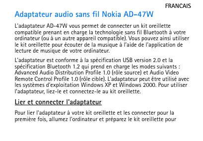 Nous, NOKIA CORPORATION, déclarons sous notre seule responsabilité la conformité du produit AD-47W aux dispositions de la directive française 1999/5/CE. La déclaration de conformité peut être consultée à l'adresse suivante: http://www.nokia.com/phones/declaration_of_conformity/.