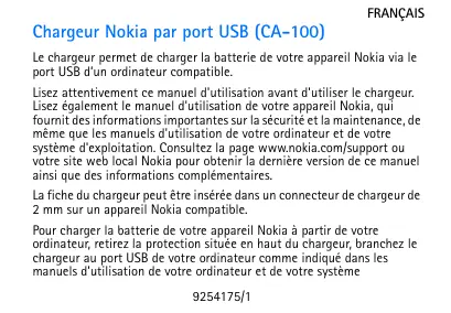 CHARGER VIA USB PORT CA-100 - Chargeur NOKIA - Notice d'utilisation et mode d'emploi gratuit