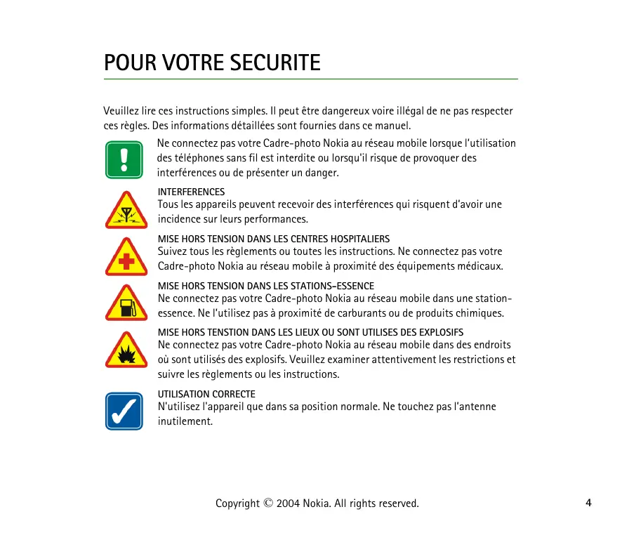 Suivez tous les règlements ou toutes les instructions. Ne connectez pas votre Cadre-photo Nokia au réseau mobile à proximité des équipements Médicaux.
