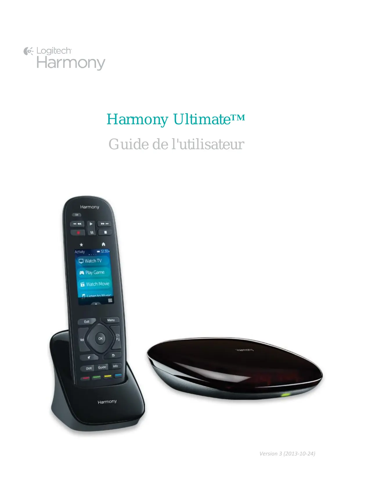 Logitech Harmony Ultimate Guide de l'utilisateur de Harmony Ultimate Table des matières À propos de ce manuel Termes utilisés dans ce manuel. Résumé. Fonctionnalités Connaître votre Harmony Ultimate Fonctions de la télécommande Charge de la télécommande Hub Harmony et mini-relais IR Fonctionnement de votre Harmony Ultimate Dispositifs Activités Favoris myharmony.com …… Utilisation d'un smartphone comme télécommande Mise hors tension du système Interférence avec Harmony Ultimate Configuration initiale de la télécommande Harmony Ultimate …. Configuration matérielle Votre compte MyHarmony Installation des plug-ins de configuration Connexion de la télécommande à l'ordinateur … Assistance pour la configuration en ligne Connexion au Wi-Fi... Configuration des dispositifs à contrôler Copie d'informations de configuration depuis une autre télécommande Harmony Ajout de dispositifs. Ajout d'un dispositif inconnu