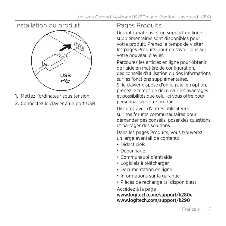 Parcourez les articles en ligne pour obtenir de l'aide en matière de configuration, des conseils d'utilisation ou des informations sur les fonctions supplémentaires. Si le clavier dispose d'un logiciel en option, prenez le temps de découvrir les avantages et possibilités que celui-ci vous offre pour personnaliser votre produit. Discutez avec d'autres utilisateurs sur nos forums communautaires pour demander des conseils, poser des questions et partager des solutions. Dans les pages Produits, vous trouverez un large éventail de contenu: • Didacticiels • Dépannage • Communauté d'entraide • Logiciels à télécharger • Documentation en ligne • Informations sur la garantie • Pièces de rechange (si disponibles) Accédez à la page www.logitech.com/support/k280e www.logitech.com/support/k290 Français
