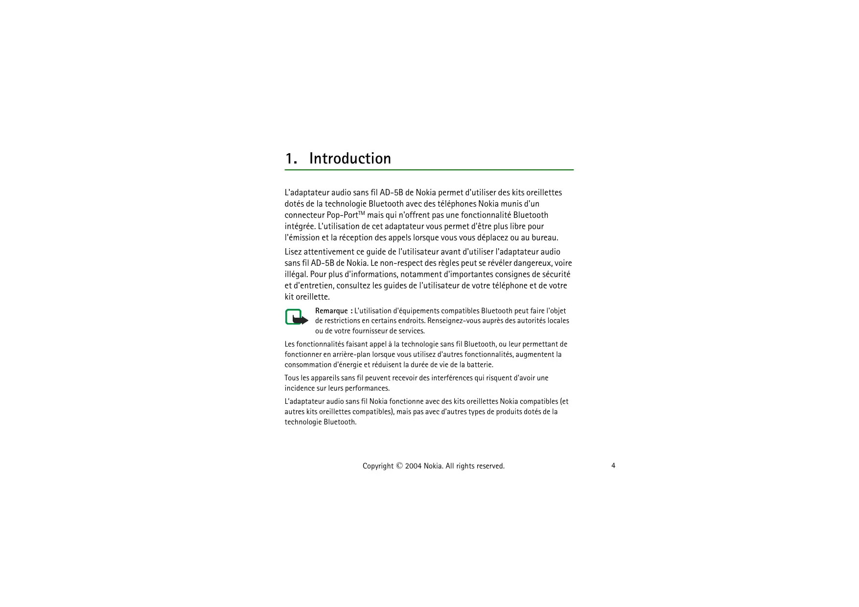 L'adaptateur audio sans fil AD-5B de Nokia permet d'utiliser des kits oreillettes dotés de la technologie Bluetooth avec des téléphones Nokia munis d'un connecteur Pop-PortTM mais qui n'offrent pas une fonctionnalité Bluetooth intégrée. L'utilisation de cet adaptateur vous permet d'être plus libre pour l'émission et la réception des appels lorsque vous vous déplacez ou au bureau. Lisez attentivement ce guide de l'utilisateur avant d'utiliser l'adaptateur audio sans fil AD-5B de Nokia. Le non-respect des règles peut se révéler dangereux, voire illégal. Pour plus d'informations, notamment d'importantes consignes de sécurité et d'entretien, consultez les guides de l'utilisateur de votre téléphone et de votre kit oreillette. Remarque : L'utilisation d'équipements compatibles Bluetooth peut faire l'objet de restrictions en certains endroits. Renseignez-vous auprès des autorités locales ou de votre fournisseur de services. Les fonctionnalités faisant appel à la technologie sans fil Bluetooth, ou leur permettant de fonctionner en arrière-plan lorsque vous utilisez d'autres fonctionnalités, augmentent la consommation d'énergie et réduisent la durée de vie de la batterie. Tous les appareils sans fil peuvent recevoir des interférences qui risquent d'avoir une incidence sur leurs performances. L’adaptateur audio sans fil Nokia fonctionne avec des kits oreillettes Nokia compatibles (et autres kits oreillettes compatibles), mais pas avec d’autres types de produits dotés de la technologie Bluetooth. Copyright © 2004 Nokia. All rights reserved.