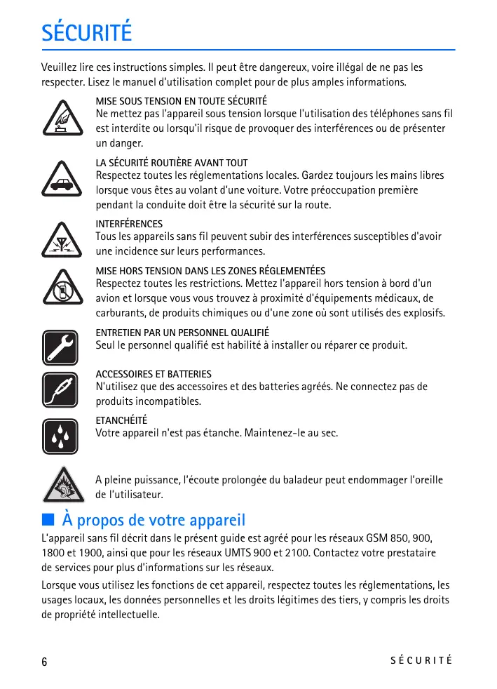 SÉCURITÉ Veuillez lire ces instructions simples. Il peut être dangereux, voire illégal de ne pas les respecter. Lisez le manuel d'utilisation complet pour de plus amples informations. MISE SOUS TENSION EN TOUTE SÉCURITÉ Ne mettez pas l'appareil sous tension lorsque l'utilisation des téléphones sans fil est interdite ou lorsqu'il risque de provoquer des interférences ou de présenter un danger. LA SÉCURITÉ ROUTIÈRE AVANT TOUT Respectez toutes les réglementations locales. Gardez toujours les mains libres lorsque vous êtes au volant d'une voiture. Votre préoccupation première pendant la conduite doit être la sécurité sur la route. INTERFÉRENCES Tous les appareils sans fil peuvent subir des interférences susceptibles d'avoir une incidence sur leurs performances. MISE HORS TENSION DANS LES ZONES RÉGLEMENTÉES Respectez toutes les restrictions. Mettez l'appareil hors tension à bord d'un avion et lorsque vous vous trouvez à proximité d'équipements médicaux, de carburants, de produits chimiques ou d'une zone où sont utilisés des explosifs.