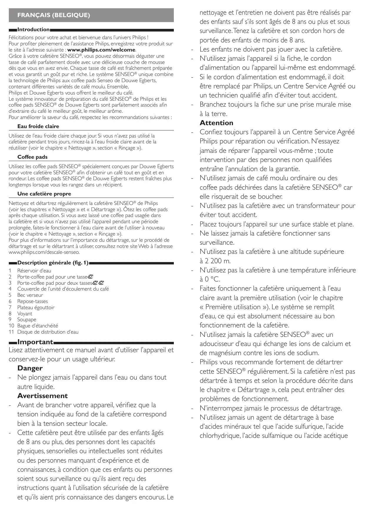 Une cafetière propre Nettoyez et détartrez régulièrement la cafetière SENSEO® de Philips (voir les chapitres « Nettoyage » et « Détartrage »). Ôtez les coffee pads après chaque utilisation. Si vous avez laissé une coffee pad usagée dans la cafetière et si vous n’avez pas utilisé l’appareil pendant une période prolongée, faites-le fonctionner à l’eau claire avant de l’utiliser à nouveau (voir le chapitre « Nettoyage », section « Rinçage »). Pour plus d’informations sur l’importance du détartrage, sur le procédé de détartrage et sur le détartrant à utiliser, consultez notre site Web à l’adresse www.philips.com/descale-senseo. Description générale (fig. 1) 1 Réservoir d’eau 2 Porte-coffee pad pour une tasse° 3 Porte-coffee pad pour deux tasses°° 4 Couvercle de l’unité d’écoulement du café 5 Bec verseur 6 Repose-tasses 7 Plateau égouttoir 8 Voyant 9 Soupape 10 Bague d’étanchéité 11 Disque de distribution d’eau Important Lisez attentivement ce manuel avant d’utiliser l’appareil et conservez-le pour un usage ultérieur. Danger -- Ne plongez jamais l’appareil dans l’eau ou dans tout autre liquide. Avertissement -- Avant de brancher votre appareil, vérifiez que la tension indiquée au fond de la cafetière correspond bien à la tension secteur locale. -- Cette cafetière peut être utilisée par des enfants âgés de 8 ans ou plus, des personnes dont les capacités physiques, sensorielles ou intellectuelles sont réduites ou des personnes manquant d’expérience et de connaissances, à condition que ces enfants ou personnes soient sous surveillance ou qu’ils aient reçu des instructions quant à l’utilisation sécurisée de la cafetière et qu’ils aient pris connaissance des dangers encourus. Le