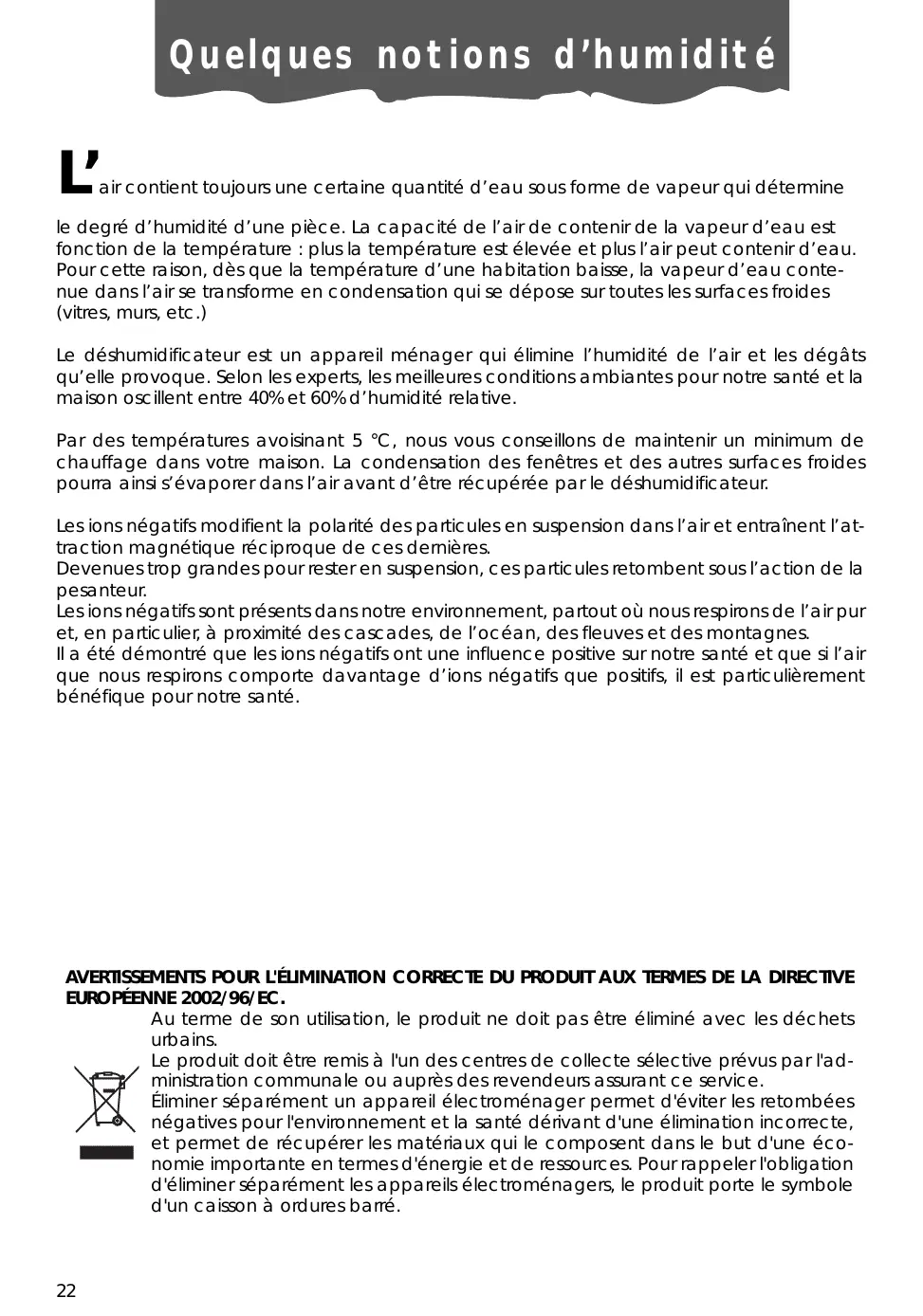 air contient toujours une certaine quantité d’eau sous forme de vapeur qui détermine le degré d’humidité d’une pièce. La capacité de l’air de contenir de la vapeur d’eau est fonction de la température : plus la température est élevée et plus l’air peut contenir d’eau. Pour cette raison, dès que la température d’une habitation baisse, la vapeur d’eau contenue dans l’air se transforme en condensation qui se dépose sur toutes les surfaces froides (vitres, murs, etc.) Le déshumidificateur est un appareil ménager qui élimine l’humidité de l’air et les dégâts qu’elle provoque. Selon les experts, les meilleures conditions ambiantes pour notre santé et la maison oscillent entre 40% et 60% d’humidité relative. Par des températures avoisinant 5 °C, nous vous conseillons de maintenir un minimum de chauffage dans votre maison. La condensation des fenêtres et des autres surfaces froides pourra ainsi s’évaporer dans l’air avant d’être récupérée par le déshumidificateur. Les ions négatifs modifient la polarité des particules en suspension dans l’air et entraînent l’attraction magnétique réciproque de ces dernières. Devenues trop grandes pour rester en suspension, ces particules retombent sous l’action de la pesanteur. Les ions négatifs sont présents dans notre environnement, partout où nous respirons de l’air pur et, en particulier, à proximité des cascades, de l’océan, des fleuves et des montagnes. Il a été démontré que les ions négatifs ont une influence positive sur notre santé et que si l’air que nous respirons comporte davantage d’ions négatifs que positifs, il est particulièrement bénéfique pour notre santé. AVERTISSEMENTS POUR L'ÉLIMINATION CORRECTE DU PRODUIT AUX TERMES DE LA DIRECTIVE EUROPÉENNE 2002/96/EC. Au terme de son utilisation, le produit ne doit pas être éliminé avec les déchets urbains. Le produit doit être remis à l'un des centres de collecte sélective prévus par l'administration communale ou auprès des revendeurs assurant ce service. Éliminer séparément un appareil électroménager permet d'éviter les retombées négatives pour l'environnement et la santé dérivant d'une élimination incorrecte, et permet de récupérer les matériaux qui le composent dans le but d'une économie importante en termes d'énergie et de ressources. Pour rappeler l'obligation d'éliminer séparément les appareils électroménagers, le produit porte le symbole d'un caisson à ordures barré.