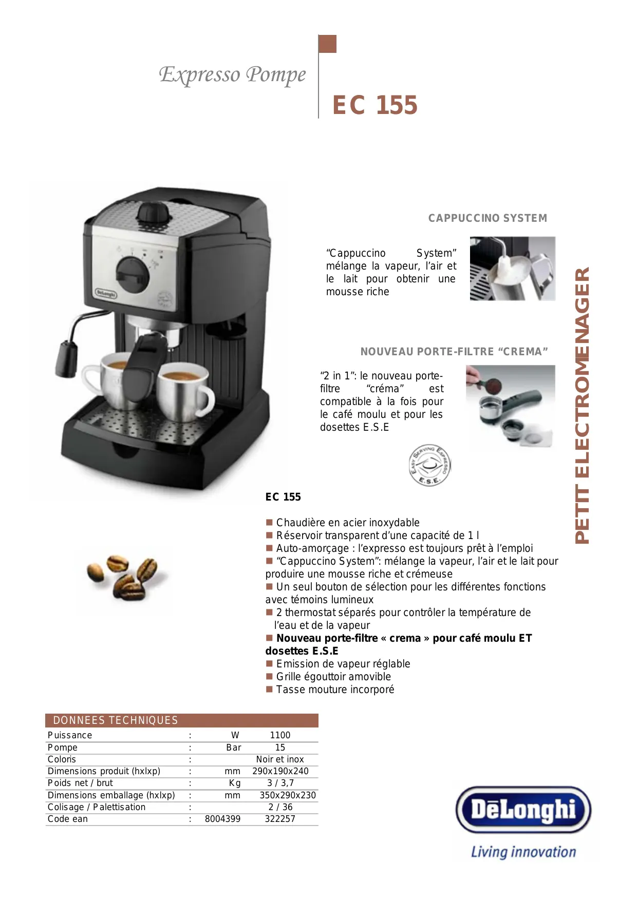 “Cappuccino System” mélange la vapeur, l'air et le lait pour obtenir une À mousse riche “2 in 1”: le nouveau porte- filtre “créma” est compatible à la fois pour le café moulu et pour les dosettes E.S.E EC 155 # Chaudière en acier inoxydable æ Réservoir transparent d'une capacité de 1 | # Auto-amorçage : l'expresso est toujours prêt à l'emploi # “Cappuccino System”: mélange la vapeur, l'air et le lait pour produire une mousse riche et crémeuse # Un seul bouton de sélection pour les différentes fonctions avec témoins lumineux # 2 thermostat séparés pour contrôler la température de l'eau et de la vapeur = Nouveau porte-filtre « crema » pour café moulu ET dosettes E.S.E m Emission de vapeur réglable # Grille égouttoir amovible m Tasse mouture incorporé Puissance : w Pompe Bar Coloris Dimensions produit (hxIxp) mm Poids net / brut : Kg Dimensions emballage (hxixp) mm Colisage / Palettisation Code ean 8004399 Noir et inox 290x190x240 313,7 350x290x230