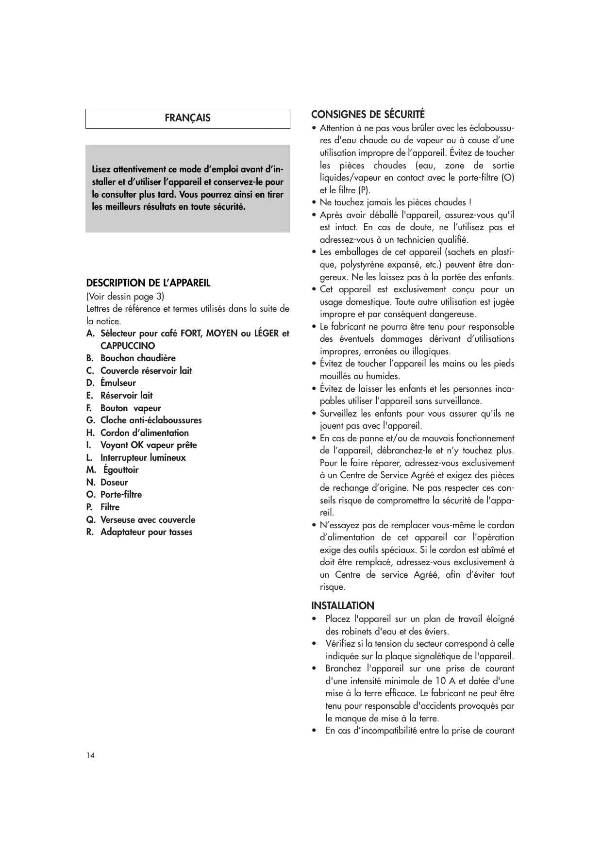 (Voir dessin page 3) Lettres de référence et termes utilisés dans la suite de la notice. A. Sélecteur pour café FORT, MOYEN ou LÉGER et CAPPUCCINO B. Bouchon chaudière C. Couvercle réservoir lait D. Émulseur E. Réservoir lait F. Bouton vapeur G. Cloche anti-éclaboussures H. Cordon d’alimentation