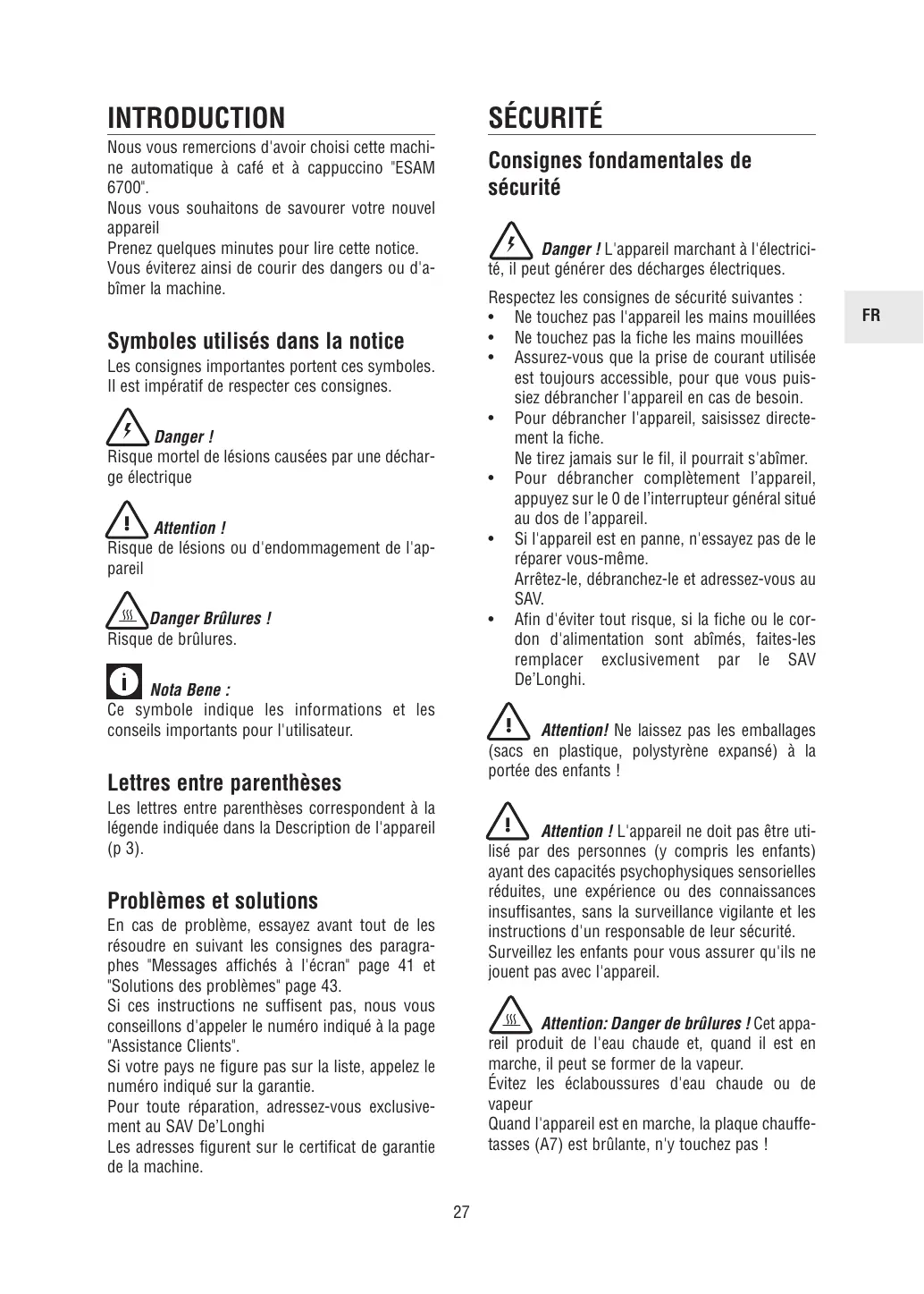 - Afin d'éviter tout risque, si la fiche ou le cordon d'alimentation sont abîmés, faites-les remplacer exclusivement par le SAV De’Longhi. Symboles utilisés dans la notice Les consignes importantes portent ces symboles. Il est impératif de respecter ces consignes. Danger ! Risque mortel de lésions causées par une décharge électrique Attention ! Risque de lésions ou d'endommagement de l'appareil Danger Brûlures ! Risque de brûlures. Nota Bene : Ce symbole indique les informations et les conseils importants pour l'utilisateur. Attention! Ne laissez pas les emballages (sacs en plastique, polystyrène expansé) à la portée des enfants ! Lettres entre parenthèses Les lettres entre parenthèses correspondent à la légende indiquée dans la Description de l'appareil (p 3). Attention ! L'appareil ne doit pas être utilisé par des personnes (y compris les enfants) ayant des capacités psychophysiques sensorielles réduites, une expérience ou des connaissances insuffisantes, sans la surveillance vigilante et les instructions d'un responsable de leur sécurité. Surveillez les enfants pour vous assurer qu'ils ne jouent pas avec l'appareil. Problèmes et solutions En cas de problème, essayez avant tout de les résoudre en suivant les consignes des paragraphes "Messages affichés à l'écran" page 41 et "Solutions des problèmes" page 43. Si ces instructions ne suffisent pas, nous vous conseillons d'appeler le numéro indiqué à la page "Assistance Clients". Si votre pays ne figure pas sur la liste, appelez le numéro indiqué sur la garantie. Pour toute réparation, adressez-vous exclusivement au SAV De’Longhi Les adresses figurent sur le certificat de garantie de la machine. Attention: Danger de brûlures ! Cet appareil produit de l'eau chaude et, quand il est en marche, il peut se former de la vapeur. Évitez les éclaboussures d'eau chaude ou de vapeur Quand l'appareil est en marche, la plaque chauffetasses (A7) est brûlante, n'y touchez pas !