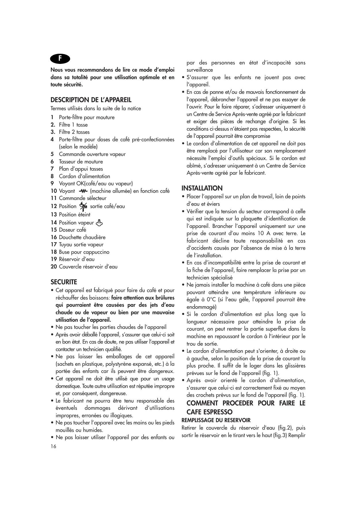 - Cet appareil est fabriqué pour faire du café et pour réchauffer des boissons: faire attention aux brûlures qui pourraient être causées par des jets d’eau chaude ou de vapeur ou bien par une mauvaise utilisation de l’appareil.