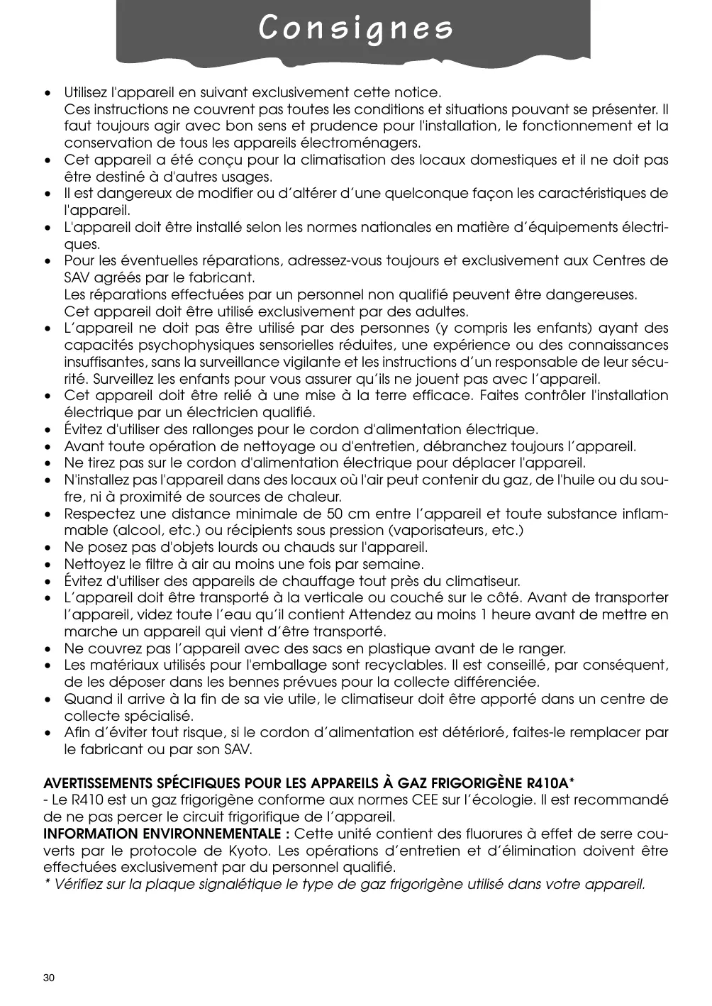 - Le R410A est un gaz frigorigène conforme aux normes CEE sur l'écologie. Il est recommandé de ne pas percer le circuit frigorifique de l'appareil.