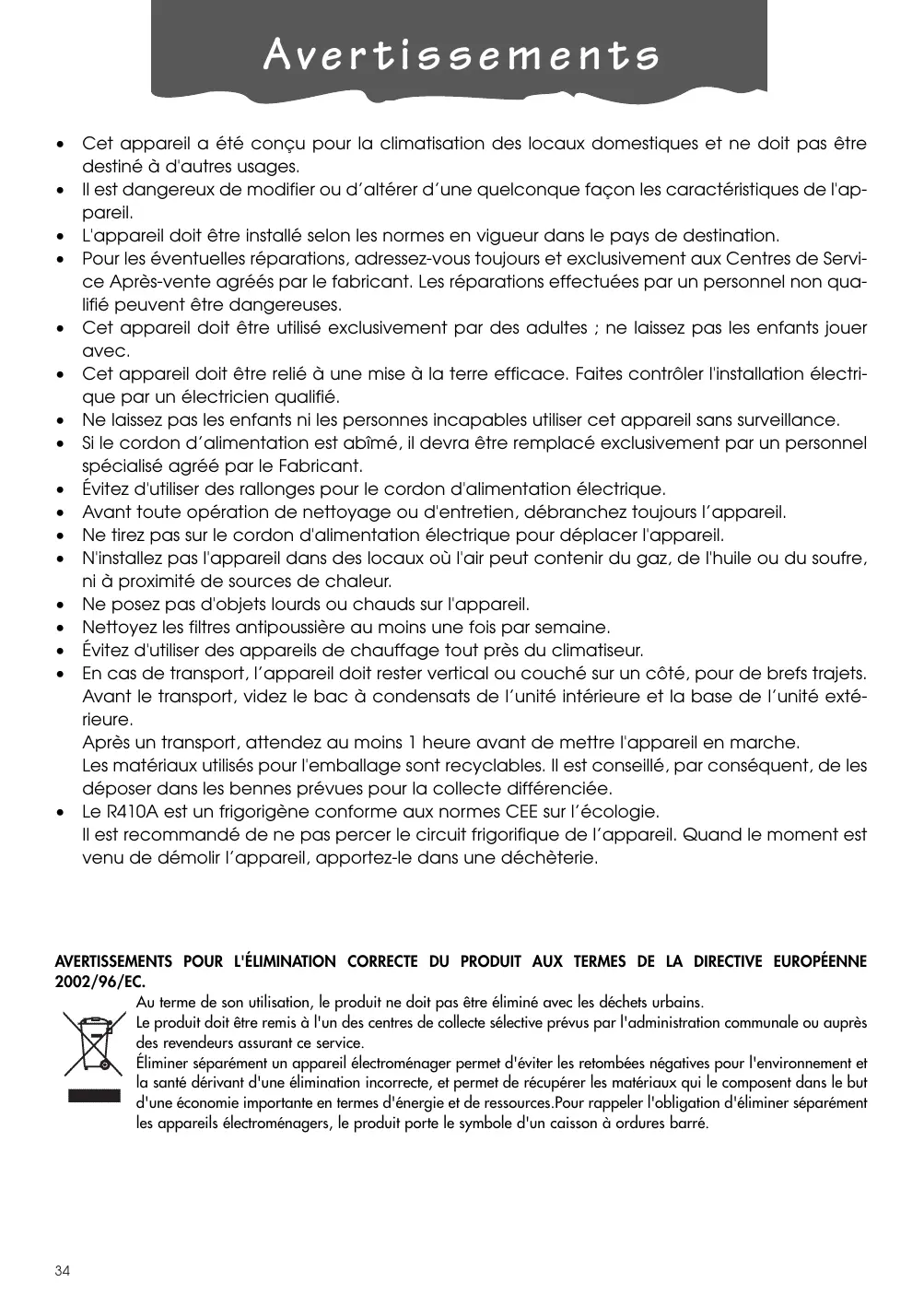 - Le R410A est un frigorigène conforme aux normes CEE sur l’écologie. Il est recommandé de ne pas percer le circuit frigorifique de l’appareil. Quand le moment est venu de démolir l’appareil, apportez-le dans une déchèterie. AVERTISSEMENTS POUR L'ÉLIMINATION CORRECTE DU PRODUIT AUX TERMES DE LA DIRECTIVE EUROPÉENNE 2002/96/EC. Au terme de son utilisation, le produit ne doit pas être éliminé avec les déchets urbains. Le produit doit être remis à l'un des centres de collecte sélective prévus par l'administration communale ou auprès des revendeurs assurant ce service. Éliminer séparément un appareil électroménager permet d'éviter les retombées négatives pour l'environnement et la santé dérivant d'une élimination incorrecte, et permet de récupérer les matériaux qui le composent dans le but d'une économie importante en termes d'énergie et de ressources.Pour rappeler l'obligation d'éliminer séparément les appareils électroménagers, le produit porte le symbole d'un caisson à ordures barré.