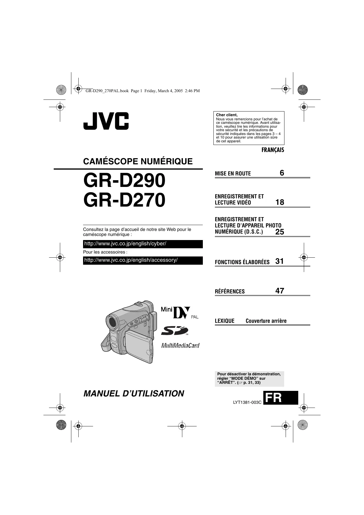 GR-D290_270PAL.book Page 1 Friday, March 4, 2005 2:46 PM Cher client, Nous vous remercions pour l’achat de ce caméscope numérique. Avant utilisation, veuillez lire les informations pour votre sécurité et les précautions de sécurité indiquées dans les pages 3 – 4 et 10 pour assurer une utilisation sûre de cet appareil. FRANÇAIS