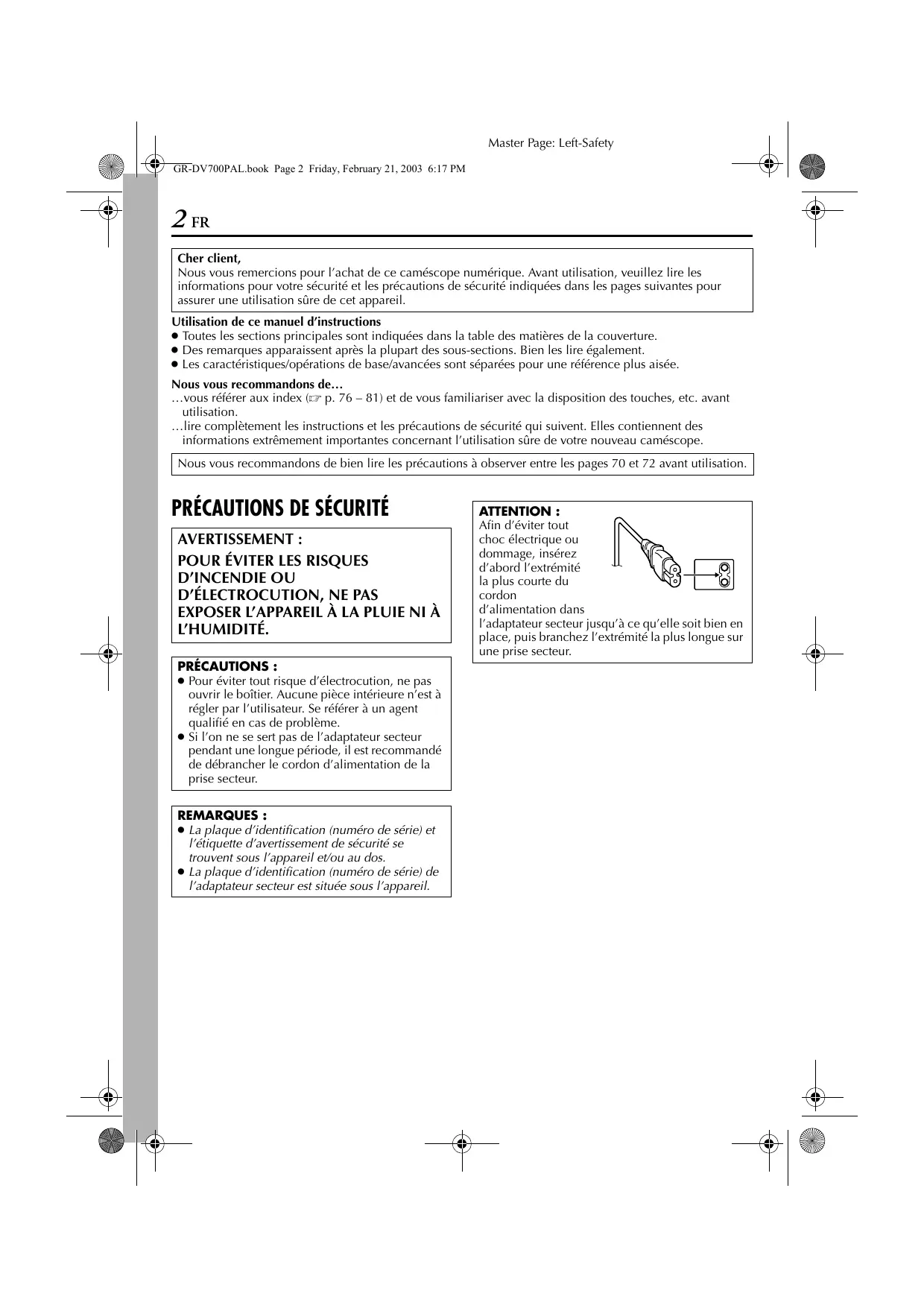 L’HUMIDITÉ. PRÉCAUTIONS : ● Pour éviter tout risque d’électrocution, ne pas ouvrir le boîtier. Aucune pièce intérieure n’est à régler par l’utilisateur. Se référer à un agent qualifié en cas de problème. ● Si l’on ne se sert pas de l’adaptateur secteur pendant une longue période, il est recommandé de débrancher le cordon d’alimentation de la prise secteur. REMARQUES : ● La plaque d’identification (numéro de série) et l’étiquette d’avertissement de sécurité se trouvent sous l’appareil et/ou au dos. ● La plaque d’identification (numéro de série) de l’adaptateur secteur est située sous l’appareil. ATTENTION : Afin d’éviter tout choc électrique ou dommage, insérez d’abord l’extrémité la plus courte du cordon d’alimentation dans l’adaptateur secteur jusqu’à ce qu’elle soit bien en place, puis branchez l’extrémité la plus longue sur une prise secteur. Master Page: Right-Safety GR-DV700PAL.book Page 3 Friday, February 21, 2003 6:17 PM