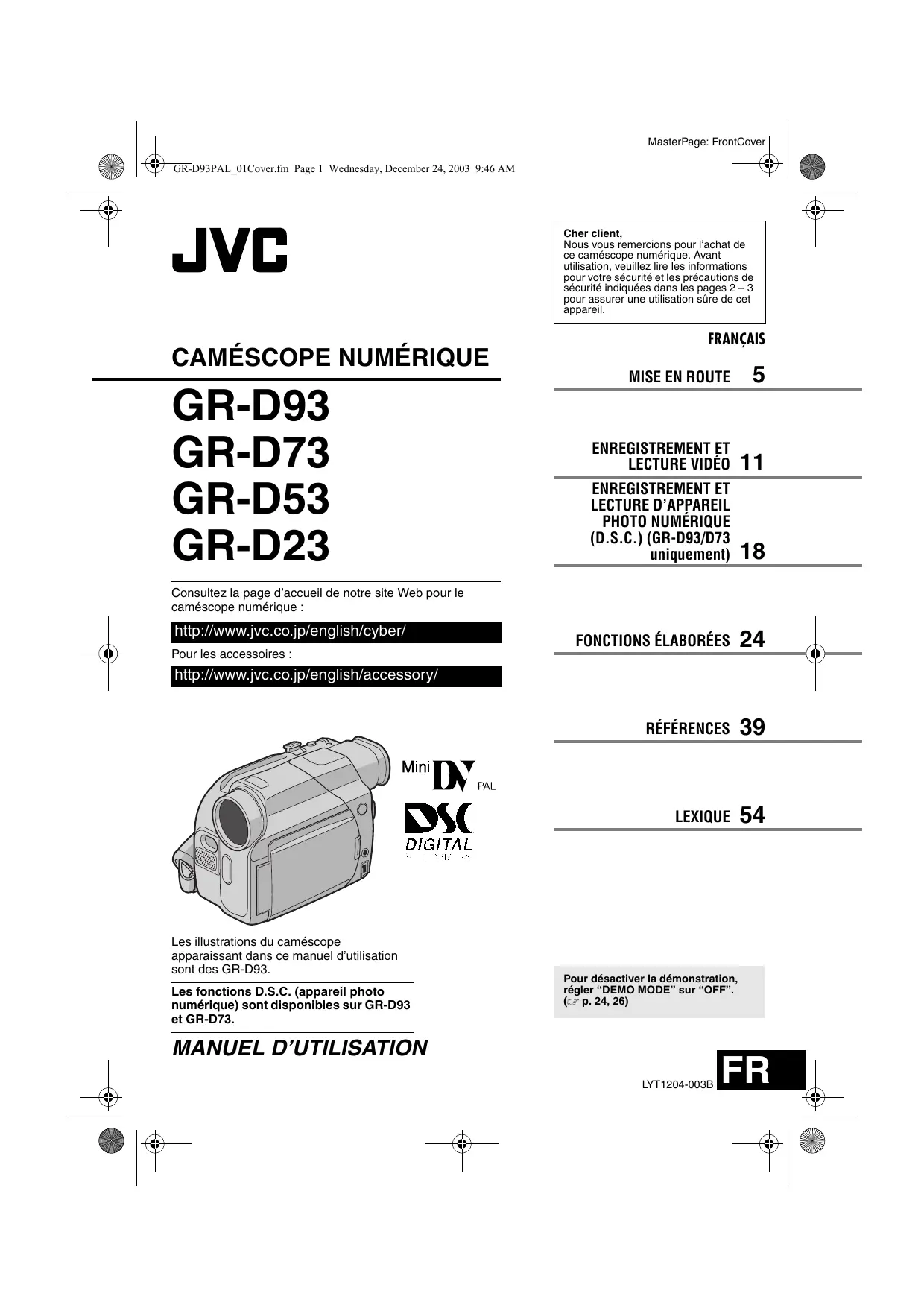 GR-D93 GR-D73 GR-D53 GR-D23 Consultez la page d'accueil de notre site Web pour le caméscope numérique : http://www.jve.co.jp/english/cyber/ Pour les accessoires http://www.jvc.co.jp/english/accessory/ Les illustrations du caméscope apparaissant dans ce manuel d'utilisation sont des GR-D93. Les fonctions D.S.C. (appareil photo numérique) sont disponibles sur GR-D93 et GR-D73. MANUEL D'UTILISATION MasterPage: FrontCover