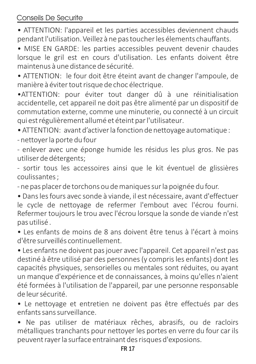 Ne pas utiliser de matérieliaux réches, abrasifs, ou de racloirs métalliques tranchants pour nettoyer les portes en verre du four car ils peuvent rayer la surface entrainant des risques d'exposions.