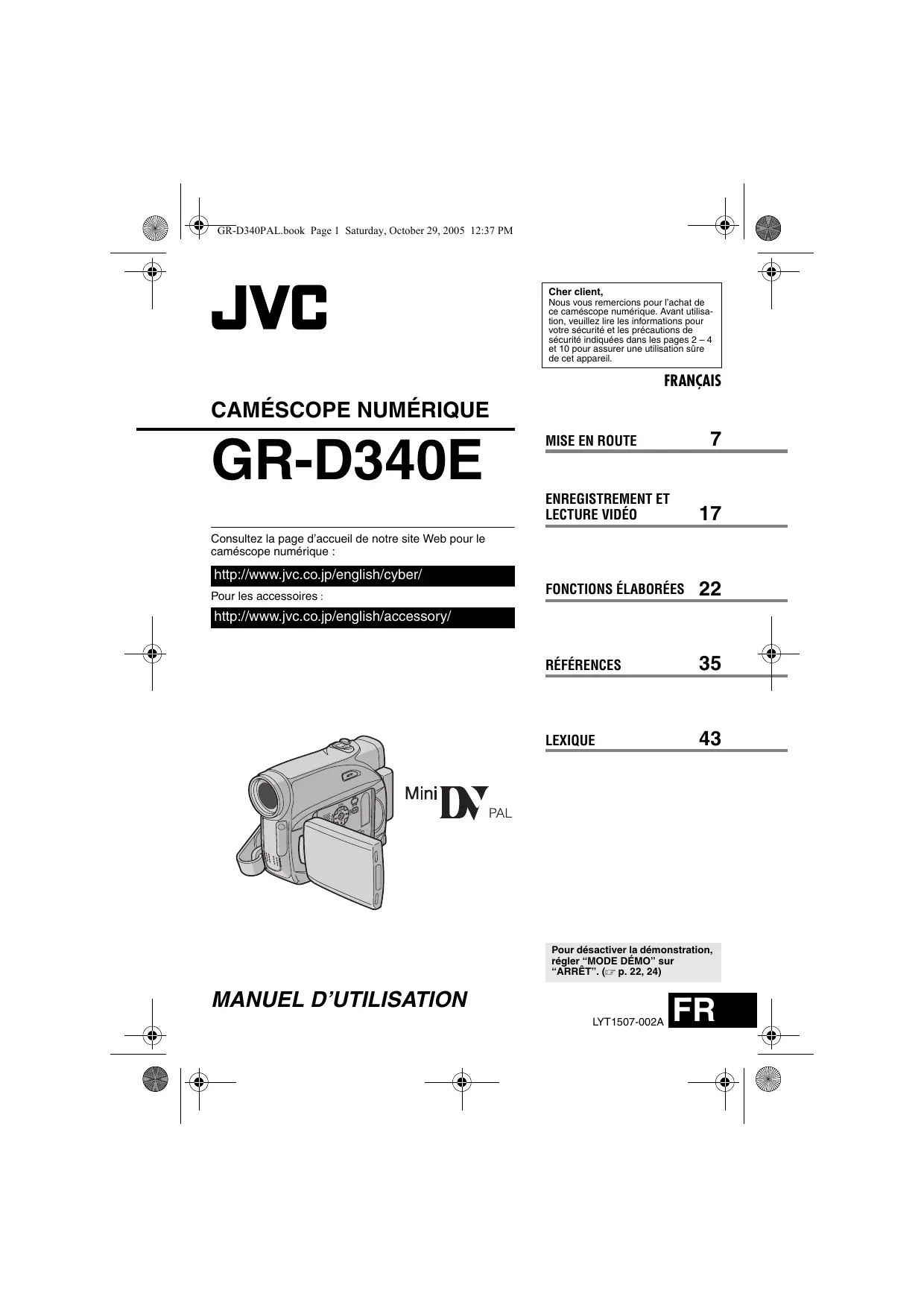 Consultez la page d’accueil de notre site Web pour le caméscope numérique : http://www.jvc.co.jp/english/cyber/ Pour les accessoires : http://www.jvc.co.jp/english/accessory/ Pour désactiver la démonstration, régler “MODE DÉMO” sur “ARRÊT”. (墌 p. 22, 24)