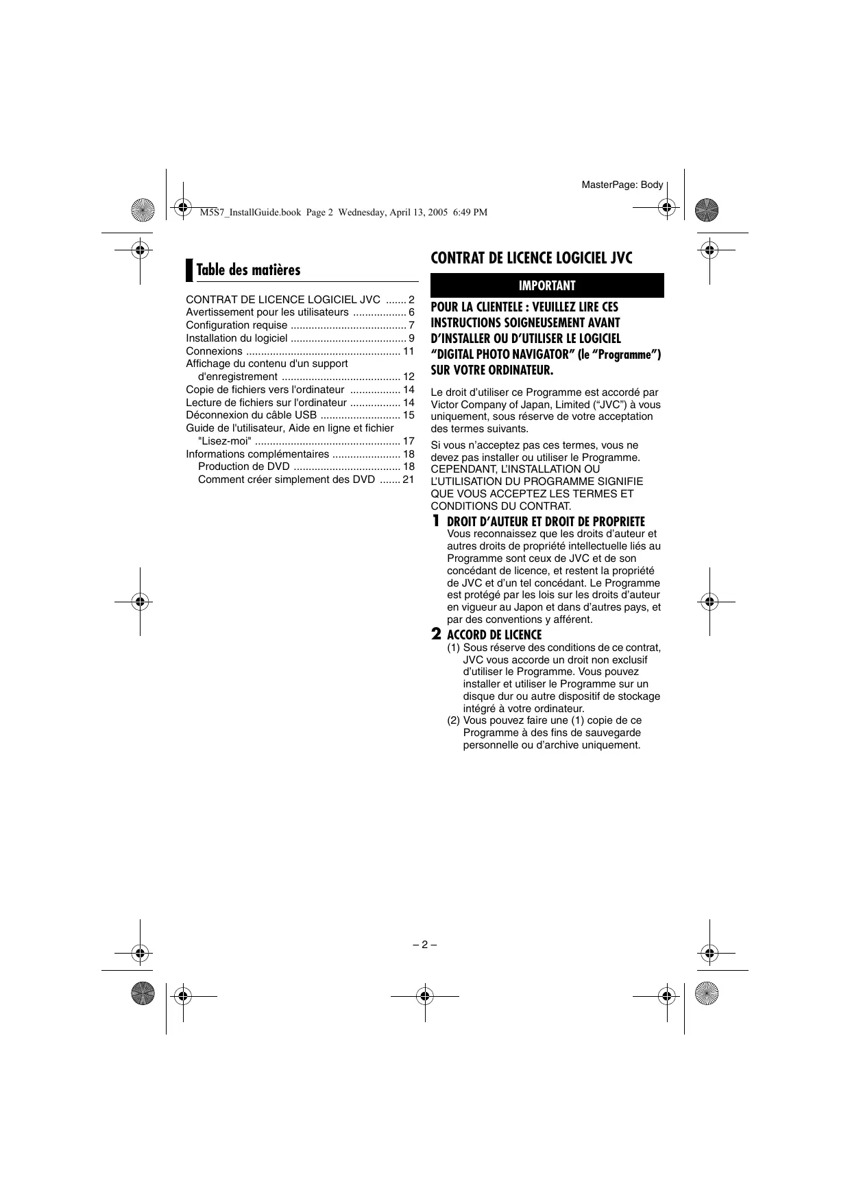(1) Sous réserve des conditions de ce contrat, JVC vous accorde un droit non exclusif d’utiliser le Programme. Vous pouvez installer et utiliser le Programme sur un disque dur ou autre dispositif de stockage intégré à votre ordinateur. (2) Vous pouvez faire une (1) copie de ce Programme à des fins de sauvegarde personnelle ou d’archive uniquement. –2– MasterPage: Body M5S7_InstallGuide.book Page 3 Wednesday, April 13, 2005 6:49 PM