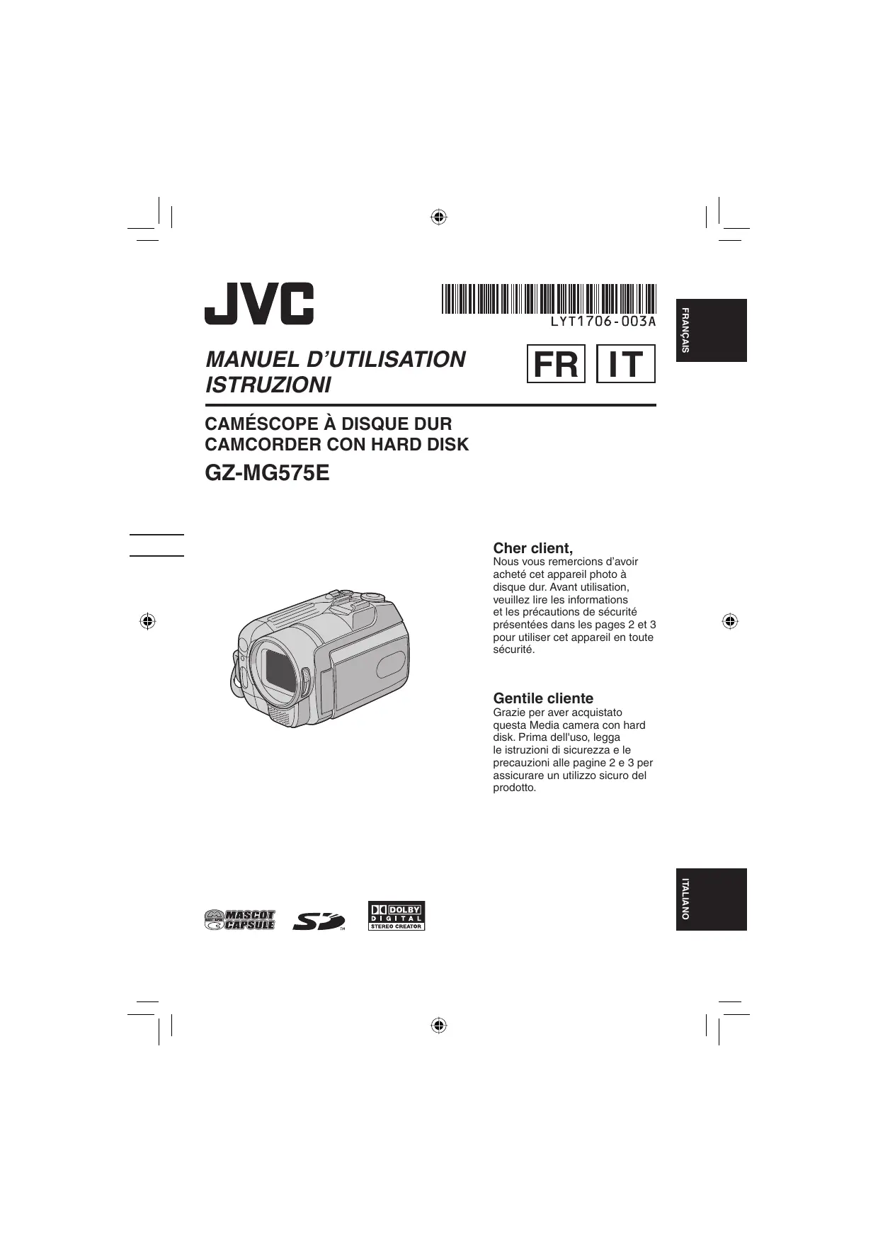 GZ-MG575E Cher client, Nous vous remercions d’avoir acheté cet appareil photo à disque dur. Avant utilisation, veuillez lire les informations et les précautions de sécurité présentées dans les pages 2 et 3 pour utiliser cet appareil en toute sécurité. Gentile cliente Grazie per aver acquistato questa Media camera con hard disk. Prima dell'uso, legga le istruzioni di sicurezza e le precauzioni alle pagine 2 e 3 per assicurare un utilizzo sicuro del prodotto. ITALIANO Précautions de sécurité
