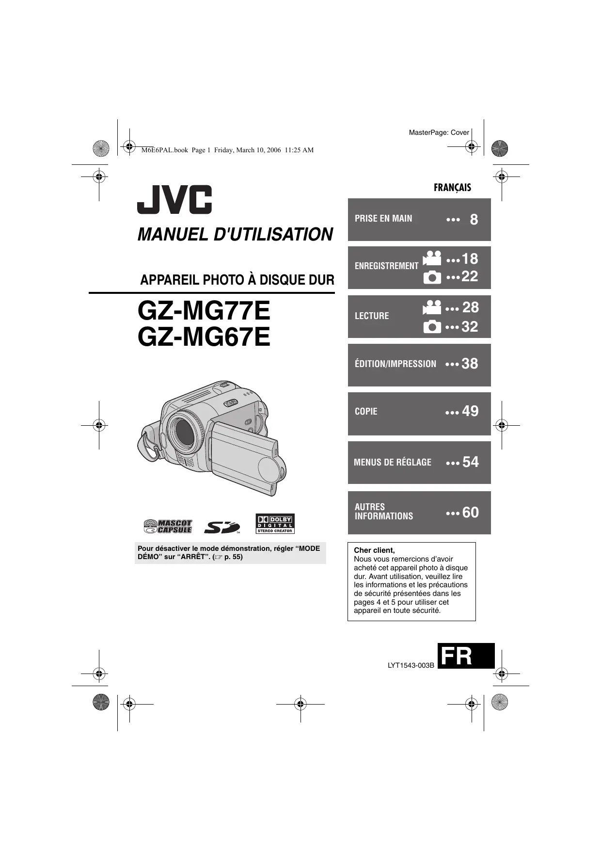 GZ-MG77E GZ-MG67E Pour désactiver le mode démonstration, régler “MODE DÉMO” sur “ARRÊT”. (墌 p. 55) Cher client, Nous vous remercions d’avoir acheté cet appareil photo à disque dur. Avant utilisation, veuillez lire les informations et les précautions de sécurité présentées dans les pages 4 et 5 pour utiliser cet appareil en toute sécurité.