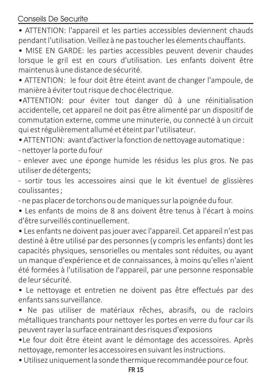 - Utilisez uniquement la sonde thermique recommandée pour ce four. FR 15