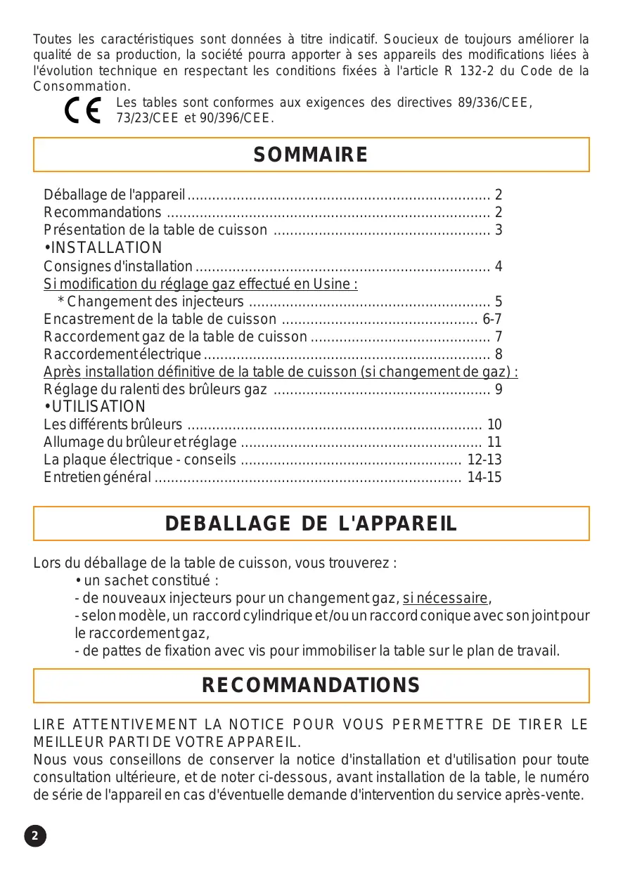 La table de cuisson est réglée en usine pour le fonctionnement au gaz dont la nature est indiquée sur l'emballage et rappelée sur l'étiquette apposée sur l'appareil.
