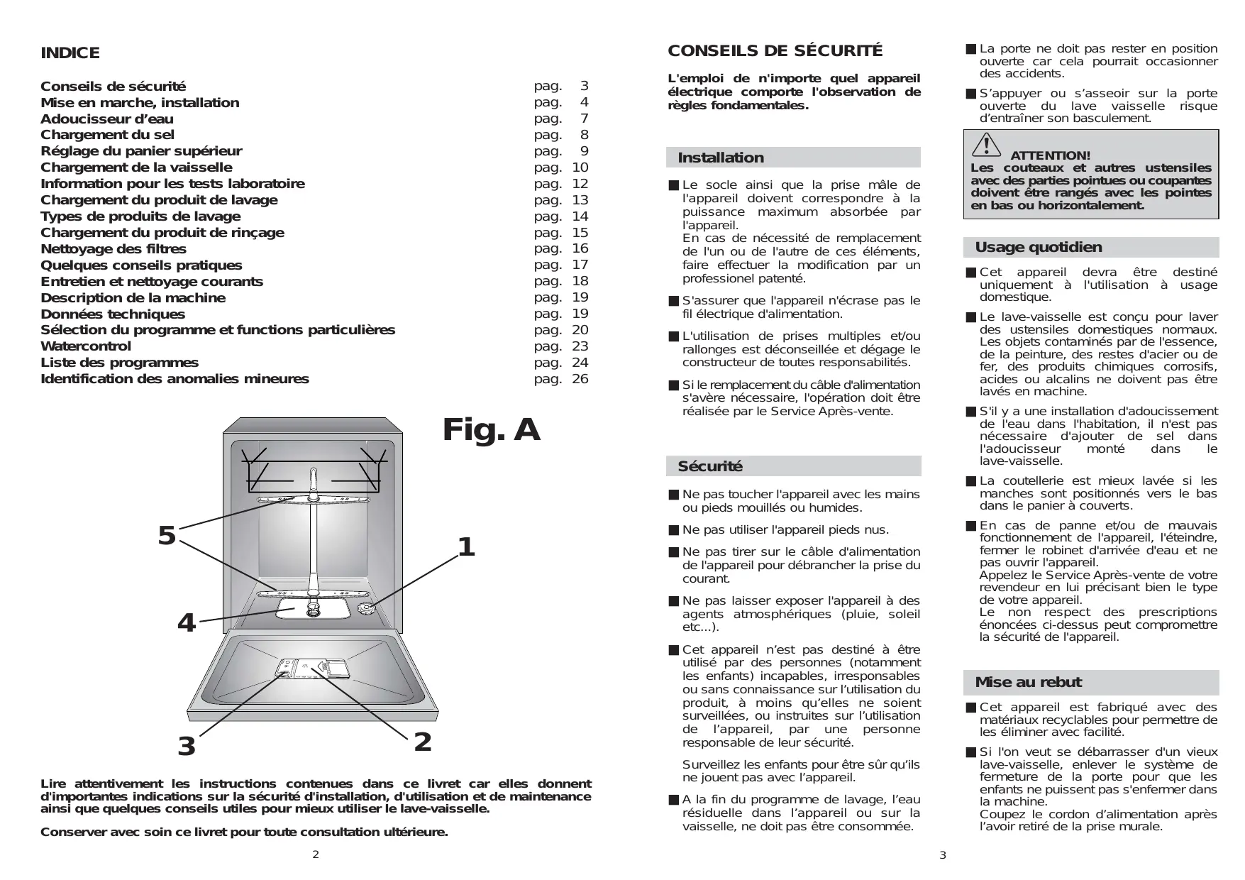 Fig. A L'emploi de n'importe quel appareil électrique comporte l'observation de règles fondamentales. ATTENTION! Les couteaux et autres ustensiles avec des parties pointues ou coupantes doivent être rangés avec les pointes en bas ou horizontalement. Installation ■ Le socle ainsi que la prise mâle de l'appareil doivent correspondre à la puissance maximum absorbée par l'appareil. En cas de nécessité de remplacement de l'un ou de l'autre de ces éléments, faire effectuer la modification par un professionel patenté. Usage quotidien ■ Cet appareil devra être destiné uniquement à l'utilisation à usage domestique. ■ Le lave-vaisselle est conçu pour laver des ustensiles domestiques normaux. Les objets contaminés par de l'essence, de la peinture, des restes d'acier ou de fer, des produits chimiques corrosifs, acides ou alcalins ne doivent pas être lavés en machine. ■ S'il y a une installation d'adoucissement de l'eau dans l'habitation, il n'est pas nécessaire d'ajouter de sel dans l'adoucisseur monté dans lave-vaisselle. ■ La coutellerie est mieux lavée si les manches sont positionnés vers le bas dans le panier à couverts. ■ En cas de panne et/ou de mauvais fonctionnement de l'appareil, l'éteindre, fermer le robinet d'arrivée d'eau et ne pas ouvrir l'appareil. Appelez le Service Après-vente de votre revendeur en lui précisant bien le type de votre appareil. Le non respect des prescriptions énoncées ci-dessus peut compromettre la sécurité de l'appareil. ■ S'assurer que l'appareil n'écrase pas le fil électrique d'alimentation. ■ L'utilisation de prises multiples et/ou rallonges est déconseillée et dégage le constructeur de toutes responsabilités. ■ Si le remplacement du câble d'alimentation s'avère nécessaire, l'opération doit être réalisée par le Service Après-vente. Sécurité ■ Ne pas toucher l'appareil avec les mains ou pieds mouillés ou humides.