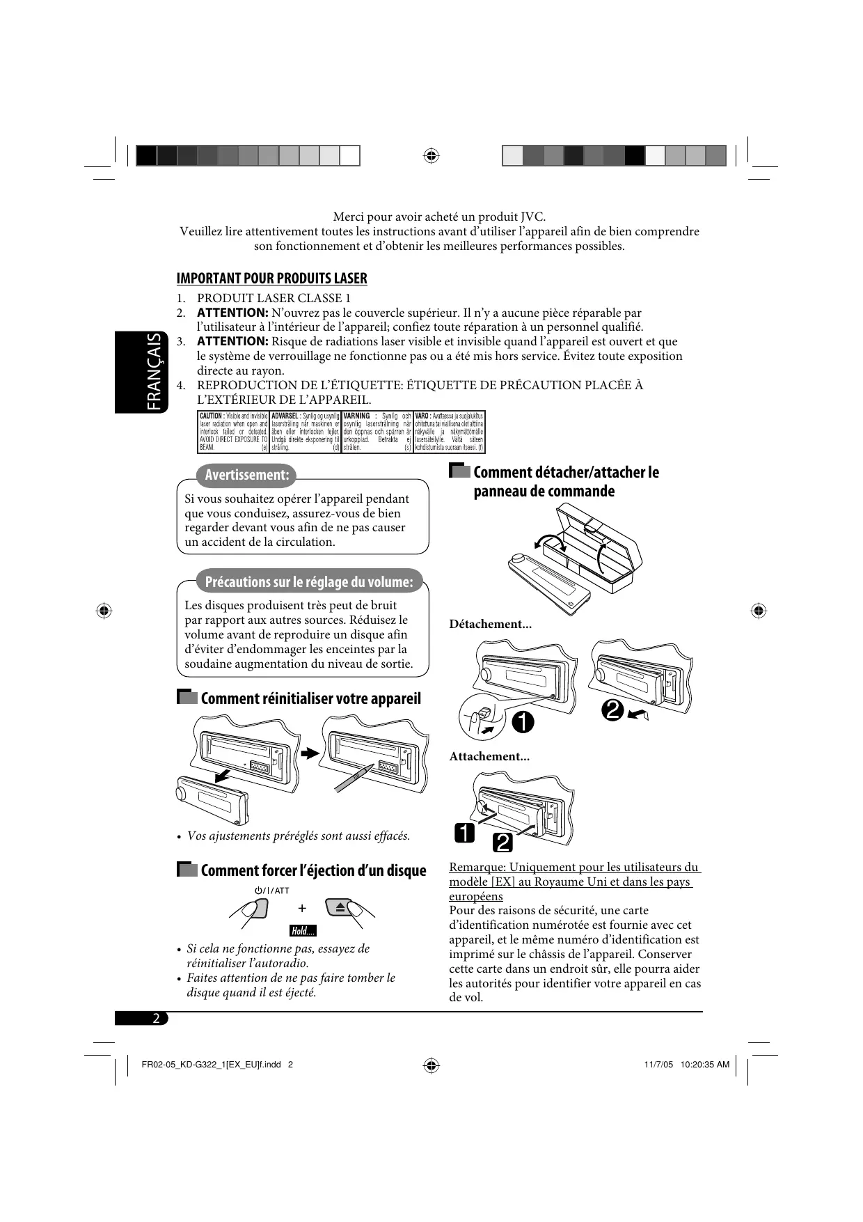 10/31/05 8:49:17 AM Merci pour avoir acheté un produit JVC. Veuillez lire attentivement toutes les instructions avant d’utiliser l’appareil afin de bien comprendre son fonctionnement et d’obtenir les meilleures performances possibles.