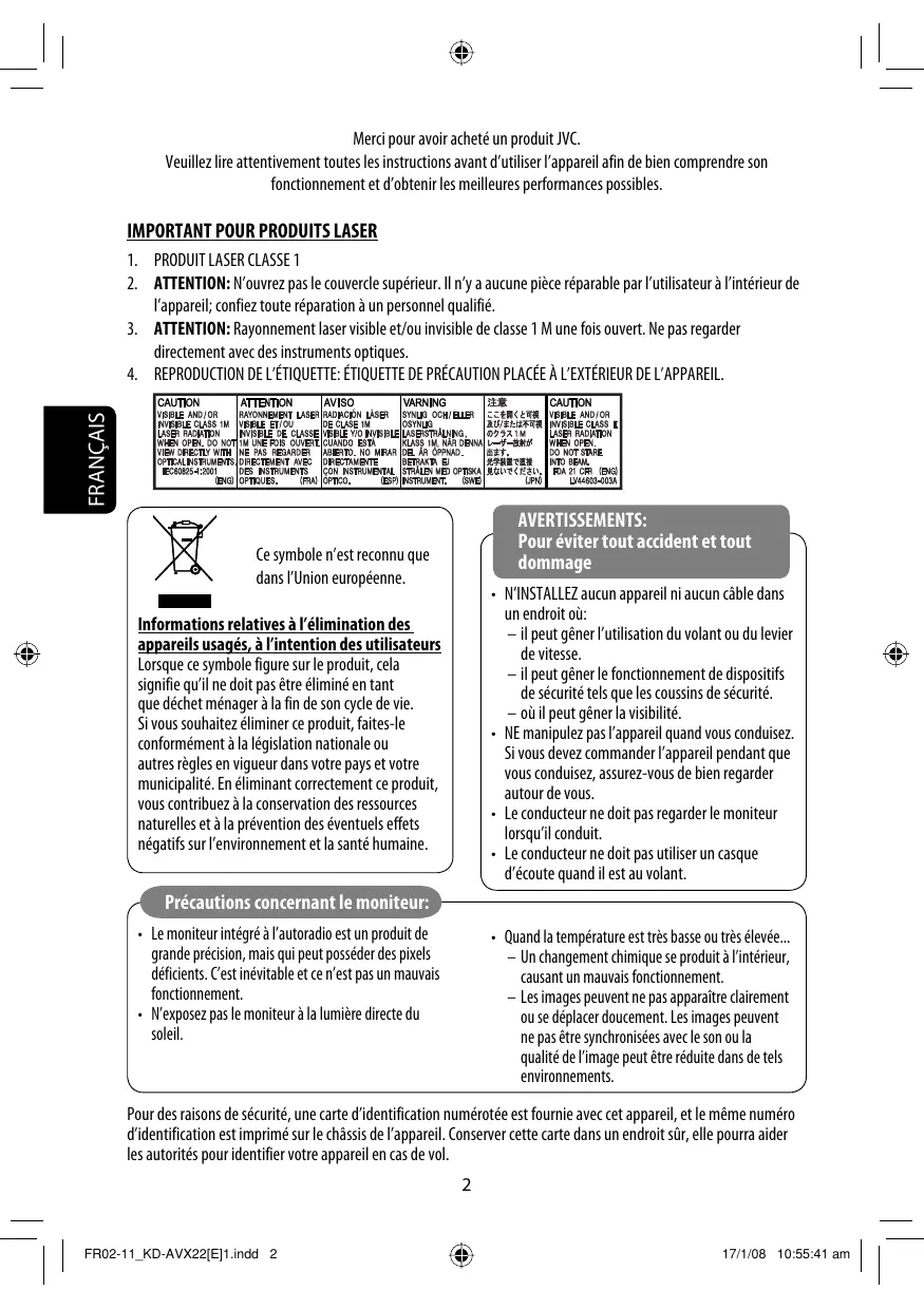 FR02-11_KD-AVX22[E]1.indd 3 17/1/08 10:55:44 am FRANÇAIS Type de disque compatible Type de disque Format d’enregistrement, type de fichier, etc. DVD DVD Vidéo (Code de région: 2)*1 DVD enregistrable/réinscriptible (DVD-R/-RW*2, +R/+RW*3)
