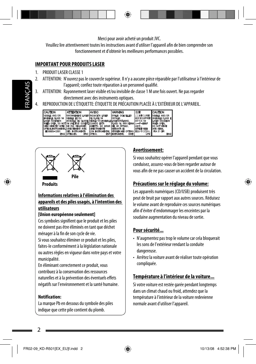 2 l'appareil; confiez toute réparation à un personnel qualifié. BA 3. ATTENTION: Rayonnement laser visible et/ou invisible de dasse 1 M une fois ouvert. Ne pas regarder Z directement avec des instruments optiques. ÉD 4. REPRODUCTION DE L'ÉTIQUETTE: ÉTIQUETTE DE PRÉCAUTION PLACÉE À L'EXTÉRIEUR DE L'APPAREIL. CE VE EU Meur on | (ae Las ucnoEn oran DRE ts a ve ee RER Fan. (EU dues AR Vo rmeuLEquun PRES PE D ne AU HE EN AE PEER nue 8 eee Va Fa Ph ire Re D iemerte Detuen leume Lion [vin D NS An ONE PP A LEE CE a it 2 al [Union européenne seulement] Ces symboles signifient que le produit et les piles ne doivent pas être éliminés en tant que déchet ménager à la fin de son cyde de vie. Sivous souhaitez éliminer ce produit et les piles, faites-le conformément à la législation nationale ou autres règles en vigueur dans votre pays et votre municipalité. En éliminant correctement ce produit, vous contribuez à la conservation des ressources naturelles et à la prévention des éventuels effets négatifs sur l'environnement et la santé humaine. Notificatior La marque Pb en dessous du symbole des piles indique que cete ile contient du plomb Avel Si vous souhaitez opérer l'appareil pendant que vous conduisez, assurez-vous de bien regarder autour de vous afin de ne pas causer un accident de la circulation. Les appareils numériques (CD/USB) produisent très peut de bruit par rapport aux autres sources. Réduisez Le volume avant de reproduire ces sources numériques afin d'éviter d'endommager es enceintes par la soudaine augmentation du niveau de sortie. Pour sécurité. + N'augmentez pas trop le volume car cela bloquerait les sons de l'extérieur rendant la conduite dangereuse. + Arrêtez la voiture avant de réaliser toute opération compliquée. Température à l'intérieur de la voiture. Sivotre voiture est restée garée pendant longtemps dans un dimat chaud ou froid, attendez que la température à l'intérieur de la voiture redevienne normale avant d'utiliser l'appareil.