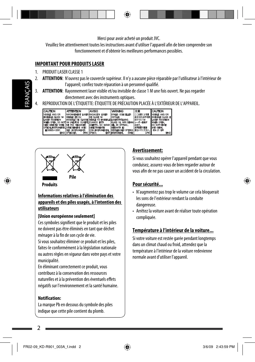 - À U: Retourne au menu précédent. D w : Valide la sélection. [3] Ajuste le niveau de volume. L#] Choisi les modes sonores préréglés [5] Choisit la source. [6] Pourles téléphones portables Bluetooth: — Appuyez brièvement pour répondre à un appel. — Maintenez pressée pour refuser l'appel. [7] + Appuyez brièvement sur ces touches pour rechercher les stations/services DAB. Maintenez cette touche pressée pour rechercher des ensembles DAB. Avance ou recule rapidement la plage si les touches sont maintenues pressées. Appuyez brièvement sur les touches pour changer. Lors de l'écoute d'un iPod (en mode de sélection de menu): Connecté avec l'adaptateur d'interface: — Appuyez brièvement sur la touche pour choisir un élément. (Puis, appuyez sur D'w pour valider Le cho). — Maintenez pressée la touche pour sauter 10 éléments en même temps. Saut vers l'arrière/saut vers l'avant pour lecteur audio Bluetooth. Avertissement (pour éviter tout accident et tout dommage + N'installez pas une autre pile qu'une CR2025 ou son & équivalent. + Ne laissez pas la télécommande dans un endroit (tel que le tableau de bord) exposé à la lumière directe du soleil pendant longtemps. + Rangez la pile dans un endroit hors d'atteinte des enfants. + Ne rechargez pas, ne court-circuitez pas, ne chauffez pas la pile ni ne la jeter dans un feu. + Ne laissez pas la pile avec d'autres objets métalliques + Ne piquez pas la pile avec des ciseaux ou d'autres objets similaires. + Enveloppez la pile de ruban isolant avant de la mettre au rebut ou de la ranger. La LL | FRO2-09_KD-R901_003A findd 8 3609 24407 PM |