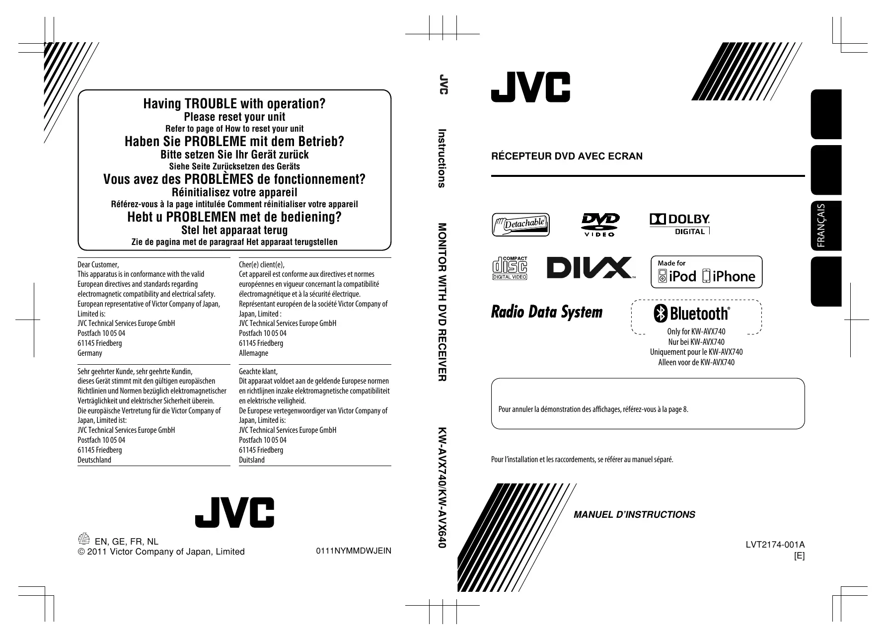 ŒIDOLBY. DIGITAL VIDEO DIVX. Radio Data System! (GBluetooth : Se OnbforkW-A74D Nur bei KW-AVX740 Uniquement pour le KW-AVX740 Alleen voor de KW-AVX740 Hier Made for SiPod dé SE) Pour annuler la démonstration des affichages, référez-vous à la page 8. Pour l'installation et les raccordements, se référer au manuel séparé. MANUEL D'INSTRUCTIONS