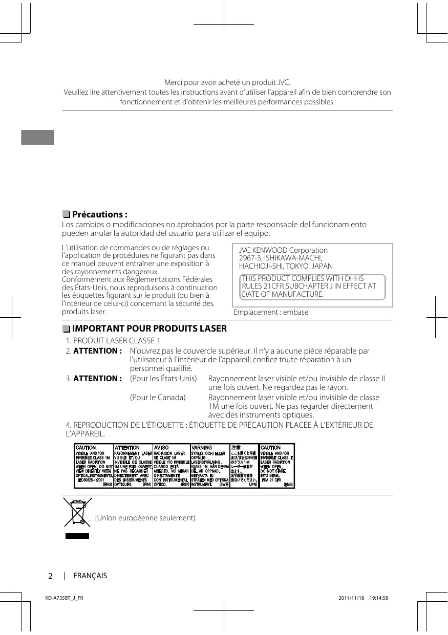 Merci pour avoir acheté un produit JVC. Veuillez lire attentivement toutes les instructions avant d’utiliser l’appareil afin de bien comprendre son fonctionnement et d’obtenir les meilleures performances possibles. Précautions : Los cambios o modificaciones no aprobados por la parte responsable del funcionamiento pueden anular la autoridad del usuario para utilizar el equipo. L’utilisation de commandes ou de réglages ou l’application de procédures ne figurant pas dans ce manuel peuvent entraîner une exposition à des rayonnements dangereux. Conformément aux Réglementations Fédérales des États-Unis, nous reproduisons à continuation les étiquettes figurant sur le produit (ou bien à l’intérieur de celui-ci) concernant la sécurité des produits laser.