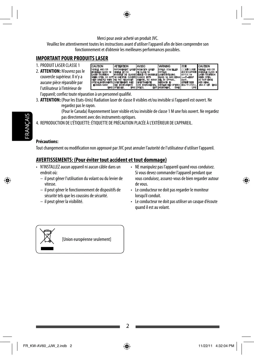 SP_KW-AV60_JJW_f.indb 75 12/12/11 4:05:49 PM Merci pour avoir acheté un produit JVC. Veuillez lire attentivement toutes les instructions avant d’utiliser l’appareil afin de bien comprendre son fonctionnement et d’obtenir les meilleures performances possibles. FRANÇAIS