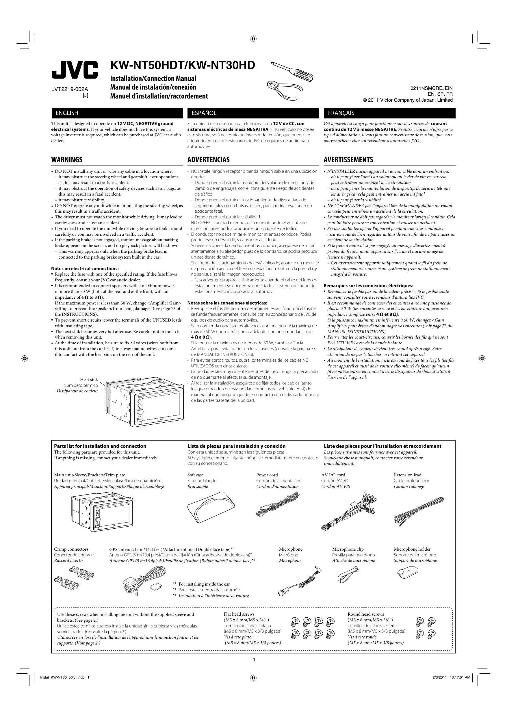 Liste des pièces pour l'installation et raccordement Les pièces suivantes sont fournies avec cet appareil. Si quelque chose manquait, contactez votre revendeur immédiatement. Extension lead Cable prolongador Cordon rallonge Microphone clip Presilla para micréfono Attache de microphone Microphone holder Soporte del micréfono Support de microphone Round head screws (M5 x 8 mm/M5 x 3/8”) Tornillos de cabeza esférica (M5 x 8 mm/MS x 3/8 pulgada) Vis à tête ronde CR (M5 x 8 mm/M5 x 3/8 pouces) | Instal_ KW-NT30_SOGJJindb +