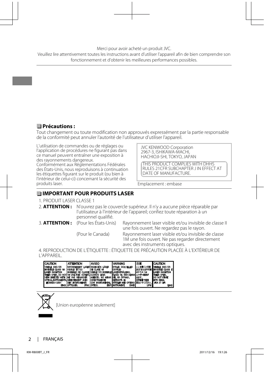 Merci pour avoir acheté un produit JVC. Veuillez lire attentivement toutes les instructions avant d’utiliser l’appareil afin de bien comprendre son fonctionnement et d’obtenir les meilleures performances possibles. Précautions : Tout changement ou toute modification non approuvés expressément par la partie responsable de la conformité peut annuler l’autorité de l’utilisateur d’utiliser l’appareil. L’utilisation de commandes ou de réglages ou l’application de procédures ne figurant pas dans ce manuel peuvent entraîner une exposition à des rayonnements dangereux. Conformément aux Réglementations Fédérales des États-Unis, nous reproduisons à continuation les étiquettes figurant sur le produit (ou bien à l’intérieur de celui-ci) concernant la sécurité des produits laser.
