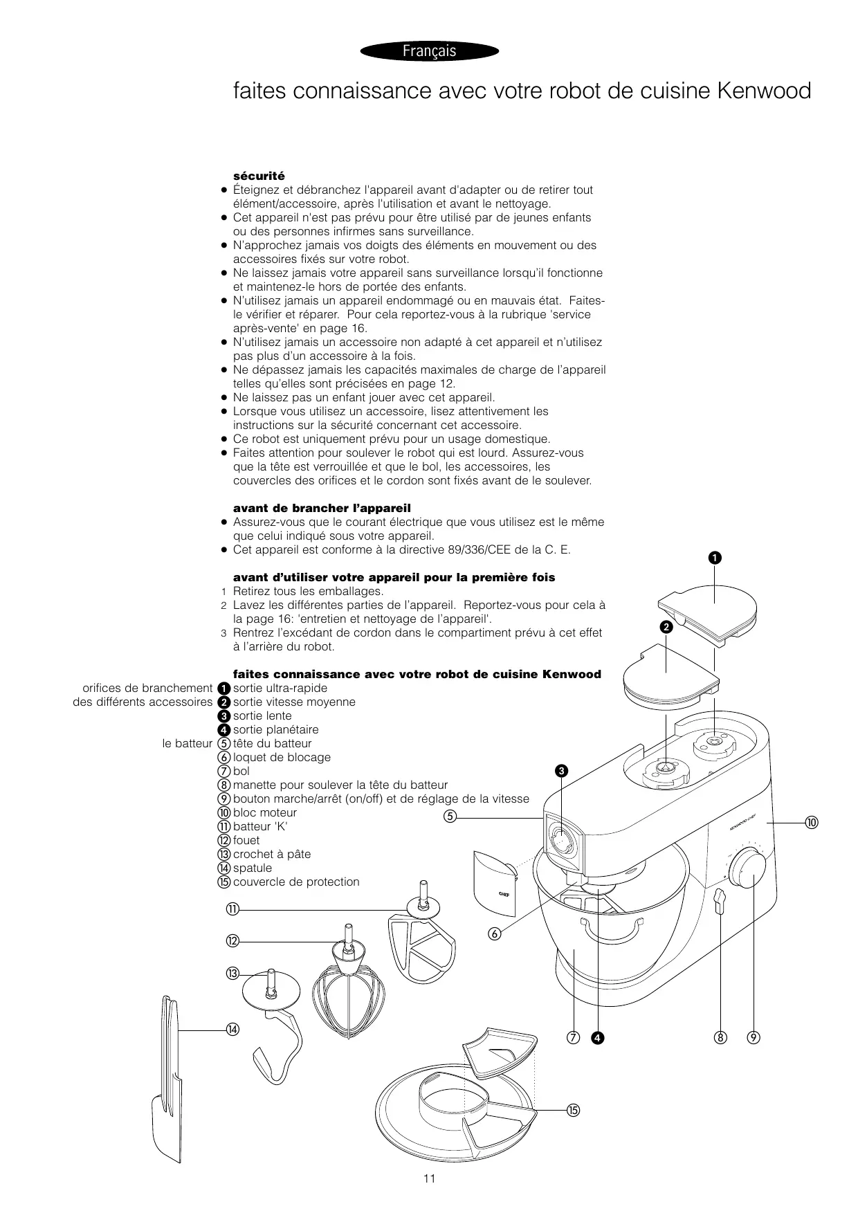 orifices de branchement des différents accessoires le batteur faites connaissance avec votre robot de cuisine Kenwood sécurité Éteignez et débranchez l'appareil avant d'adapter ou de retirer tout élément/accessoire, après l'utilisation et avant le nettoyage Cet appareil n'est pas prévu pour être utilisé par de jeunes enfants ou des personnes infirmes sans surveillance. N'approchez jamais vos doigts des éléments en mouvement ou des accessoires fixés sur votre robot. Ne laissez jamais votre appareil sans surveillance lorsqu'il fonctionne et maintenez-le hors de portée des enfants. N'utilisez jamais un appareil endommagé ou en mauvais état. Faites- le vérifier et réparer. Pour cela reportez-vous à la rubrique service après-vente’ en page 16. N'utilisez jamais un accessoire non adapté à cet appareil et n'utilisez pas plus d'un accessoire à la fois. Ne dépassez jamais les capacités maximales de charge de l'appareil telles qu'elles sont précisées en page 12 Ne laissez pas un enfant jouer avec cet appareil Lorsque vous utilisez un accessoire, lisez attentivement les instructions sur la sécurité concernant cet accessoire. Ce robot est uniquement prévu pour un usage domestique. Faites attention pour soulever le robot qui est lourd. Assurez-vous que la tête est verrouillée et que le bol, les accessoires, les couvercles des orifices et le cordon sont fixés avant de le soulever. avant de brancher l'appareil Assurez-vous que le courant électrique que vous utilisez est le même que celui indiqué sous votre appareil Cet appareil est conforme à la directive 89/336/CEE de la C. E avant d'utiliser votre appareil pour la première fois Retirez tous les emballages: Lavez les différentes parties de l'appareil. Reportez-vous pour cela à la page 16: ‘entretien et nettoyage de l'appareil Rentrez l'excédant de cordon dans le compartiment prévu à cet effet à l'arrière du robot DCE