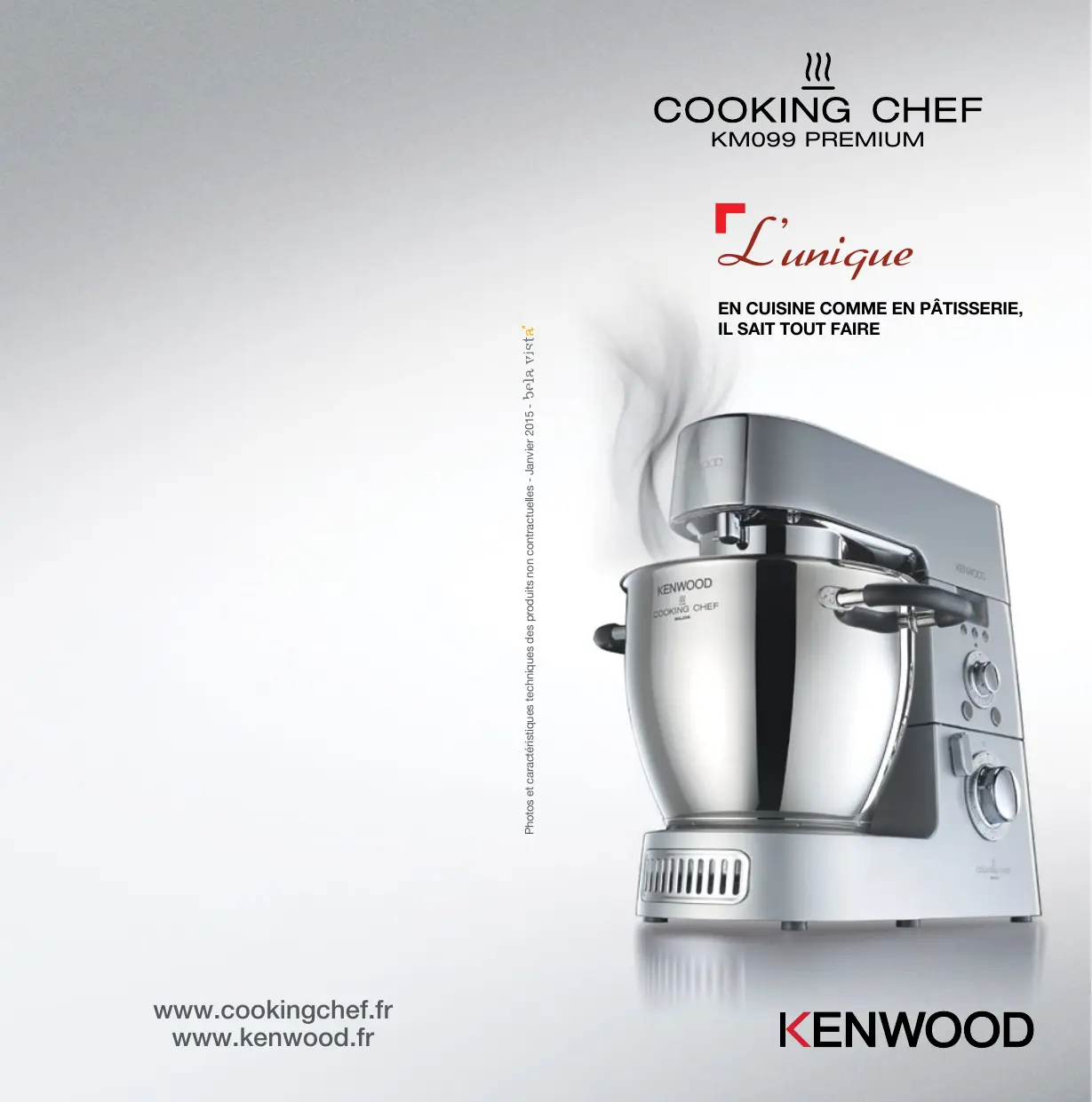 KM099 PREMIUM L'unique Photos et caractéristiques techniques des produits non contractuelles - Janvier 2015 - En cuisine comme en pâtisserie, il sait tout faire www.cookingchef.fr www.kenwood.fr L'unique Le robot tout en un Le robot KENWOOD savait déjà mélanger, pétrir, fouetter, mixer, battre, émulsionner, râper et émincer comme personne ! Maintenant il cuit tout en mélangeant, une fonction essentielle en cuisine. Plus besoin de rester des heures devant le feu à tourner et mélanger vos préparations. Un robot ultra polyvalent ! Grâce aux nombreux outils livrés avec le robot, le Cooking Chef Premium est un robot cuiseur très polyvalent pour une utilisation au quotidien. Il permet de réaliser des pains, des desserts, des entremets, mais aussi de mixer, râper et émincer les légumes et autres ingrédients. 6 modes de cuisson Grâce à l’induction et à la température réglable jusqu’à 140°C, vous pouvez cuire à basse température, cuire à la vapeur, bouillir, saisir, rissoler ou encore mijoter. L’héritier des techniques de cuisiniers Le fondateur de Kenwood, Kenneth Wood s’est inspiré des techniques du monde professionnel pour créer ses robots et rendre accessible l’expertise des plus grands Chefs. Le COOKING CHEF PREMIUM reproduit ainsi parfaitement le tour de main du cuisinier. Le kit pâtisserie Composé de 3 outils en acier inoxydable pour réussir rapidement et facilement les préparations chaudes ou froides