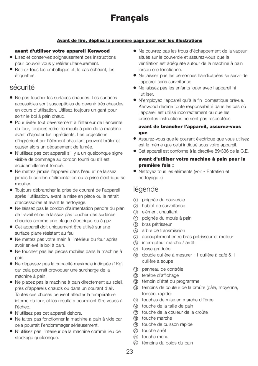 Ne couvrez pas les trous d'échappement de la vapeur situés sur le couvercle et assurez-vous que la ventilation est adéquate autour de la machine à pain lorsqu elle fonctionne. Ne laissez pas les personnes handicapées se servir de l'appareil sans surveillance. Ne laissez pas les enfants jouer avec l’appareil ni l’utiliser. N’employez l’appareil qu’à la fin domestique prévue. Kenwood décline toute responsabilité dans les cas où l’appareil est utilisé incorrectement ou que les présentes instructions ne sont pas respectées. avant de brancher l’appareil, assurez-vous que Assurez-vous que le courant électrique que vous utilisez est le même que celui indiqué sous votre appareil. Cet appareil est conforme à la directive 89/336 de la C.E. avant d'utiliser votre machine à pain pour la première fois : Nettoyez tous les éléments (voir « Entretien et nettoyage ») légende