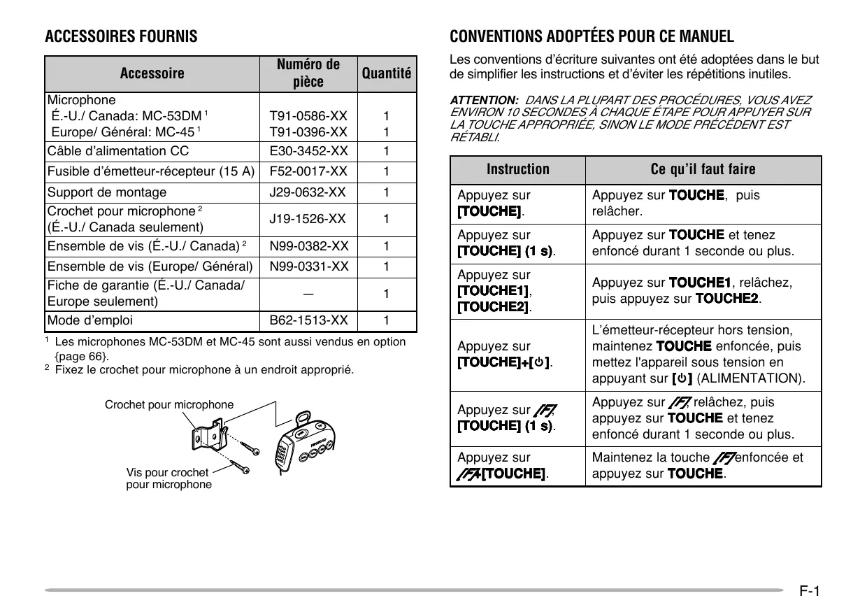 ATTENTION: DANS LA PLUPART DES PROCÉDURES, VOUS AVEZ ENVIRON 10 SECONDES À CHAQUE ÉTAPE POUR APPUYER SUR LA TOUCHE APPROPRIÉE, SINON LE MODE PRÉCÉDENT EST RÉTABLI. Instruction Ce qu’il faut faire Appuyez sur [TOUCHE]. Appuyez sur TOUCHE, puis relâcher. Appuyez sur [TOUCHE] (1 s). Appuyez sur TOUCHE et tenez enfoncé durant 1 seconde ou plus. Appuyez sur [TOUCHE1], [TOUCHE2]. Appuyez sur TOUCHE1, relâchez, puis appuyez sur TOUCHE2. Appuyez sur [TOUCHE]+[ ]. L’émetteur-récepteur hors tension, maintenez TOUCHE enfoncée, puis mettez l'appareil sous tension en appuyant sur [ ] (ALIMENTATION). Crochet pour microphone Appuyez sur [F], [TOUCHE] (1 s). Appuyez sur [F], relâchez, puis appuyez sur TOUCHE et tenez enfoncé durant 1 seconde ou plus. Vis pour crochet pour microphone [F]+[TOUCHE]. Ensemble de vis (Europe/ Général) Fiche de garantie (É.-U./ Canada/ Europe seulement) Mode d’emploi