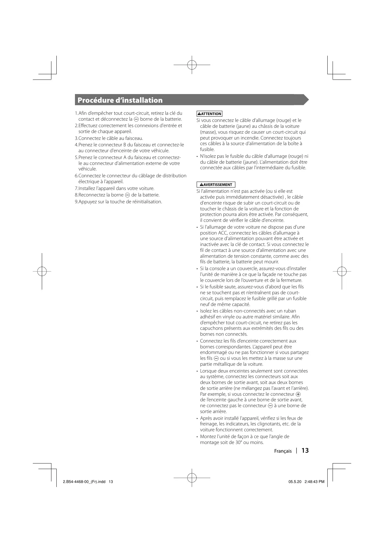Procédure d'installation 1.Afin d'empêcher tout court-circuit, retirez la clé du contact et déconnectez la © borne de la batterie. 2.Effectuez correctement les connexions d'entrée et sortie de chaque appareil 3.Connectez le câble au faisceau. 4.Prenez le connecteur B du faisceau et connectez-le au connecteur d'enceinte de votre véhicule. 5.Prenez le connecteur A du faisceau et connectez- le au connecteur d'alimentation externe de votre véhicule. 6 Connectez le connecteur du câblage de distribution électrique à l'appareil Z.installez l'appareil dans votre voiture 8.Reconnectez la borne © de la batterie. 9.Appuyez sur la touche de réinitialisation: 2.854-4468-00_(Frjindd 13 Si vous connectez le câble d'allumage (rouge) et le cäble de batterie (jaune) au châssis de la voiture {masse), vous risquez de causer un court-circuit qui peut provoquer un incendie. Connectez toujours ces câbles à la source d'alimentation de la boîte à fusible. + N'isolez pas le fusible du céble d'allumage (rouge) ni du cäble de batterie (jaune). L'alimentation doit être connectée aux câbles par l'intermédiaire du fusible. Si l'alimentation n'est pas activée (ou si elle est activée puis immédiatement désactivée), le câble d'enceinte risque de subir un court-circuit ou de toucher le chéssis de la voiture et la fonction de protection pourra alors être activée. Par conséquent, il convient de vérifier le câble d'enceinte. Si l'allumage de votre voiture ne dispose pas d'une position ACC, connectez les câbles d'allumage à une source d'alimentation pouvant être activée et inactivée avec la clé de contact. Si vous connectez le fil de contact à une source d'alimentation avec une alimentation de tension constante, comme avec des fils de batterie, la batterie peut mourir. - Si la console a un couvercle, assurez-vous d'installer l'unité de manière à ce que la façade ne touche pas le couvercle lors de l'ouverture et de la fermeture. Si le fusible saute, assurez-vous d'abord que les fils ne se touchent pas et n'entraînent pas de court- circuit, puis remplacez le fusible grillé par un fusible neuf de même capacité Isolez les câbles non-connectés avec un ruban adhésif en vinyle ou autre matériel similaire. Afin d'empêcher tout court-circuit, ne retirez pas les capuchons présents aux extrémités des fils ou des bornes non connectés. Connectez les fils d'enceinte correctement aux bornes correspondantes. L'appareil peut être endommagé ou ne pas fonctionner si vous partagez les fils © ou si vous les mettez à la masse sur une partie métallique de la voiture + Lorsque deux enceintes seulement sont connectées au système, connectez les connecteurs soit aux deux bornes de sortie avant, soit aux deux bornes de sortie arrière (ne mélangez pas l'avant et l'arrière) Par exemple, si vous connectez le connecteur ® de l'enceinte gauche à une bome de sortie avant, ne connectez pas le connecteur © à une borne de sortie arrière. + Après avoir installé l'appareil vérifiez si les feux de freinage, les indicateurs, les clignotants, etc. de la voiture fonctionnent correctement. Montez l'unité de façon à ce que l'angle de montage soit de 30° ou moins. Français | 13