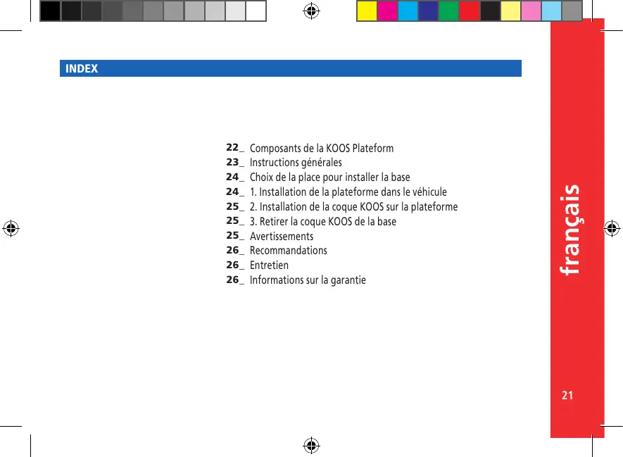 Composants de la KOOS Plateform Instructions générales Choix de la place pour installer la base 1. Installation de la plateforme dans le véhicule 2. Installation de la coque KOOS sur la plateforme 3. Retirer la coque KOOS de la base Avertissements Recommandations Entretien Informations sur la garantie