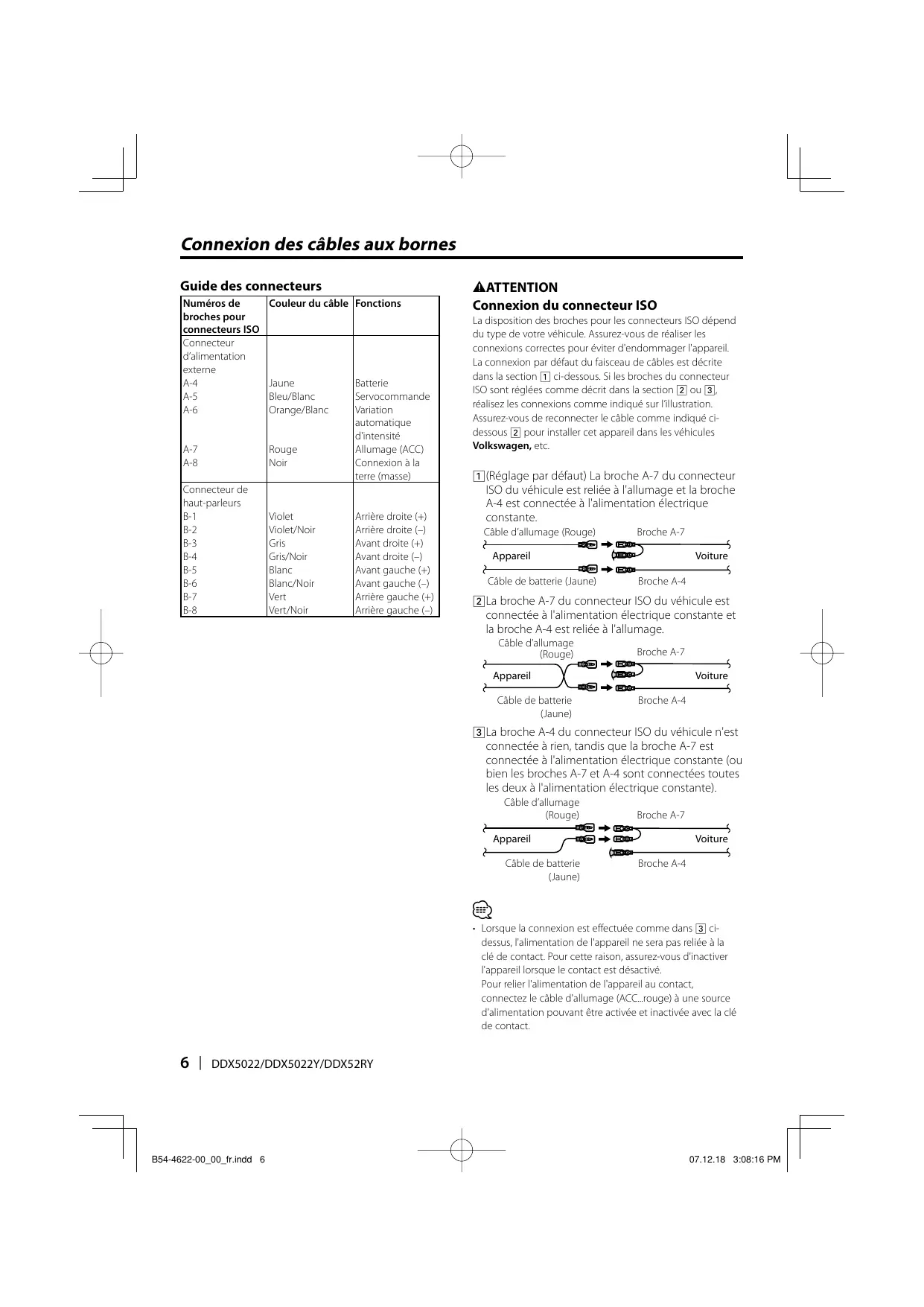 Câble de batterie (Jaune) Câble d’allumage (Rouge) Connecteur B Cordon de l'antenne (Orange/Blanc) Câble de commande du gradateur (Orange/Blanc) ILLUMI Connectez au faisceau du commutateur de détection de frein à main du véhicule. Câble du capteur de stationnement (Vert clair) PRK SW Par mesure de sécurité, connecter le câble du détecteur de stationnement. Connectez au faisceau des feux arrières du véhicule lors de l'utilisation de la caméra de vue arrière en option. Vers la télécommande de direction Câble de capteur de marche arrière (Violet/Blanc) Entrée de la commande de direction (Bleu clair/jaune) Pour utiliser la fonction de télécommande de direction, vous avez besoin d'un adaptateur de télécommande spécial (non fourni) qui correspond à votre véhicule. Lorsque cette borne n'est pas utilisée, laissez son capuchon en place. Connectez à une prise qui est à la masse soit quand le téléphone sonne soit pendant une conversation. Câble de sourdine (Brun) Pour connecter le système de navigation Kenwood, consultez le manuel du système de navigation. Connectez soit à la borne de contrôle de l'alimentation lors de l'utilisation de l'amplificateur de puissance en option, soit à la borne de contrôle de l'antenne du véhicule. Câble de commande de l'alimentation/de l'antenne motorisée (Bleu/Blanc) Si aucune connexion n'est faite, ne laissez pas le câble sortir à l'extérieur. 4 | Ventilateur de refroidissement Connexion des câbles aux bornes Guide des connecteurs Numéros de broches pour connecteurs ISO Connecteur d’alimentation externe A-4 A-5 A-6 Couleur du câble Fonctions Batterie Servocommande Variation automatique d'intensité Allumage (ACC) Connexion à la terre (masse) Arrière droite (+) Arrière droite (–) Avant droite (+) Avant droite (–) Avant gauche (+) Avant gauche (–) Arrière gauche (+) Arrière gauche (–) 2ATTENTION Connexion du connecteur ISO La disposition des broches pour les connecteurs ISO dépend du type de votre véhicule. Assurez-vous de réaliser les connexions correctes pour éviter d'endommager l'appareil. La connexion par défaut du faisceau de câbles est décrite dans la section 1 ci-dessous. Si les broches du connecteur ISO sont réglées comme décrit dans la section 2 ou 3, réalisez les connexions comme indiqué sur l’illustration. Assurez-vous de reconnecter le câble comme indiqué cidessous 2 pour installer cet appareil dans les véhicules Volkswagen, etc. 1 (Réglage par défaut) La broche A-7 du connecteur ISO du véhicule est reliée à l'allumage et la broche A-4 est connectée à l'alimentation électrique constante. Câble d’allumage (Rouge) Broche A-7 Appareil Câble de batterie (Jaune) Voiture Broche A-4 2 La broche A-7 du connecteur ISO du véhicule est connectée à l'alimentation électrique constante et la broche A-4 est reliée à l'allumage. Câble d’allumage (Rouge) Broche A-7 Appareil Câble de batterie (Jaune) Voiture Broche A-4 3 La broche A-4 du connecteur ISO du véhicule n'est connectée à rien, tandis que la broche A-7 est connectée à l'alimentation électrique constante (ou bien les broches A-7 et A-4 sont connectées toutes les deux à l'alimentation électrique constante). Câble d’allumage (Rouge) Broche A-7 Appareil Câble de batterie (Jaune) Voiture Broche A-4