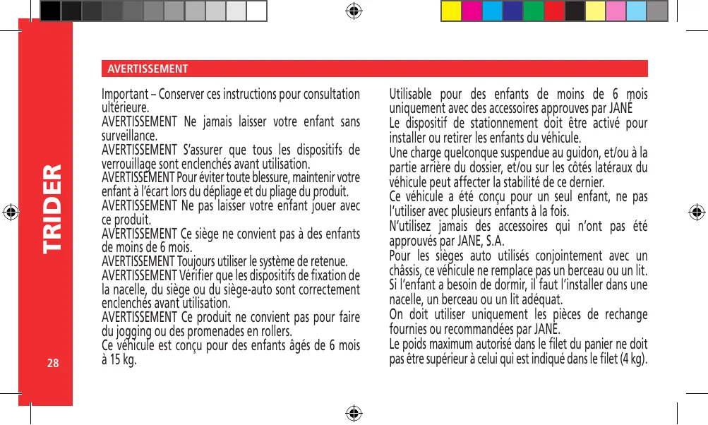 Le dispositif de stationnement doit être activé pour installer ou retirer les enfants du véhicule. Une charge quelconque suspendue au guidon, et/ou à la partie arrière du dossier, et/ou sur les côtés latéraux du véhicule peut affecter la stabilité de ce dernier. Ce véhicule a été conçu pour un seul enfant, ne pas l’utiliser avec plusieurs enfants à la fois. N’utilisez jamais des accessoires qui n’ont pas été approuvés par JANE, S.A. Pour les sièges auto utilisés conjointement avec un châssis, ce véhicule ne remplace pas un berceau ou un lit. Si l’enfant a besoin de dormir, il faut l’installer dans une nacelle, un berceau ou un lit adéquat. On doit utiliser uniquement les pièces de rechange fournies ou recommandées par JANE. Le poids maximum autorisé dans le filet du panier ne doit pas être supérieur à celui qui est indiqué dans le filet (4 kg).